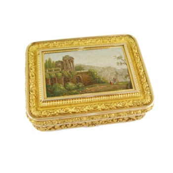 19th century chased rectangular gold box mounted with a micromosaic of the Temple of Vesta at Tivoli, the box by Jean-Baptiste Fossin, Paris 1819-1838, the mosaic Italian. c.1810,
