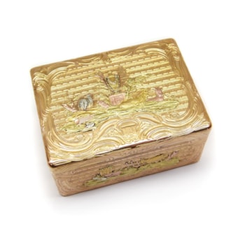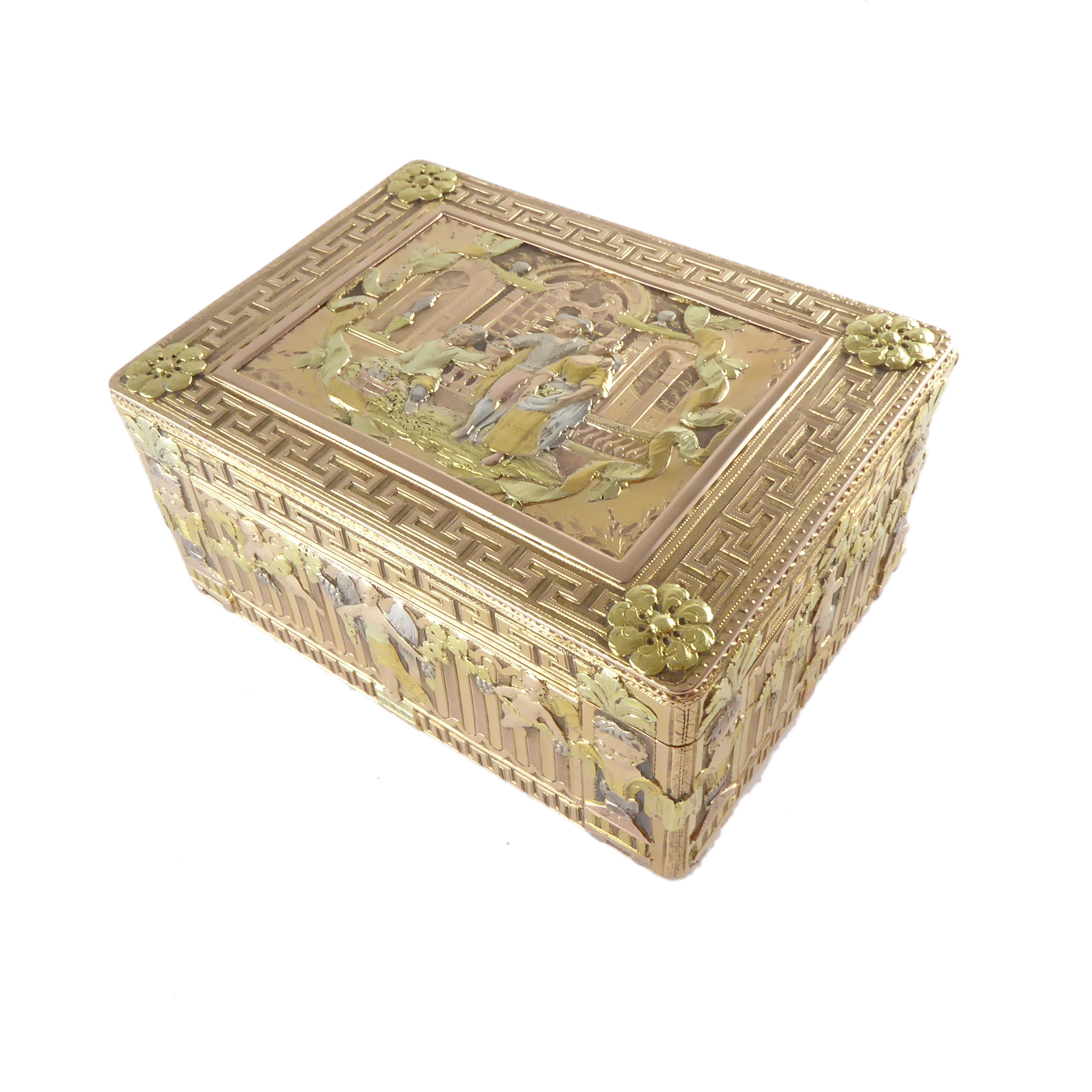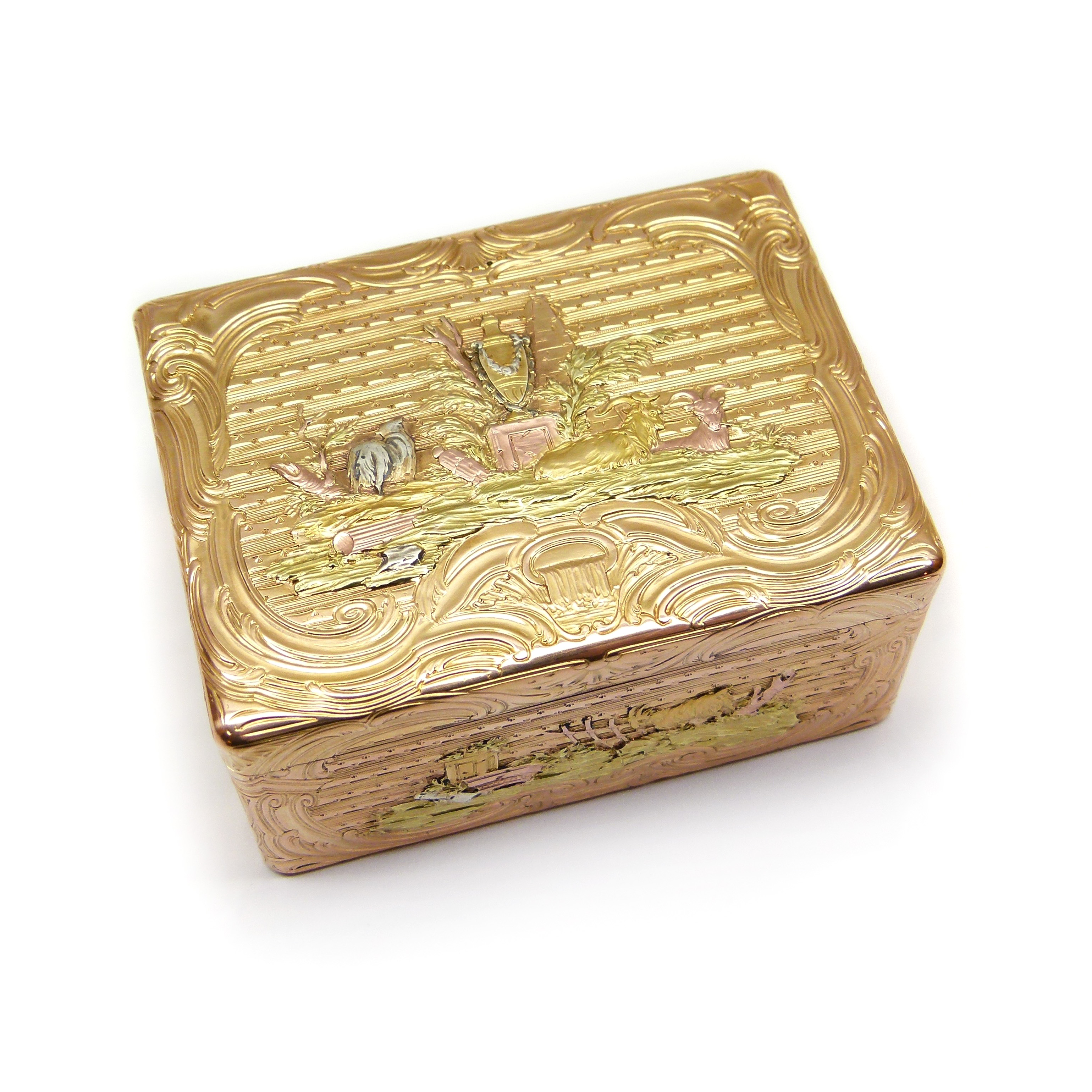 18th century German coloured gold rectangular box by Les Freres Toussaint, Hanau c.1760, formerly Rothschild family collection, chased and engraved with figural decoration in yellow, rose, lemon gold and silver,