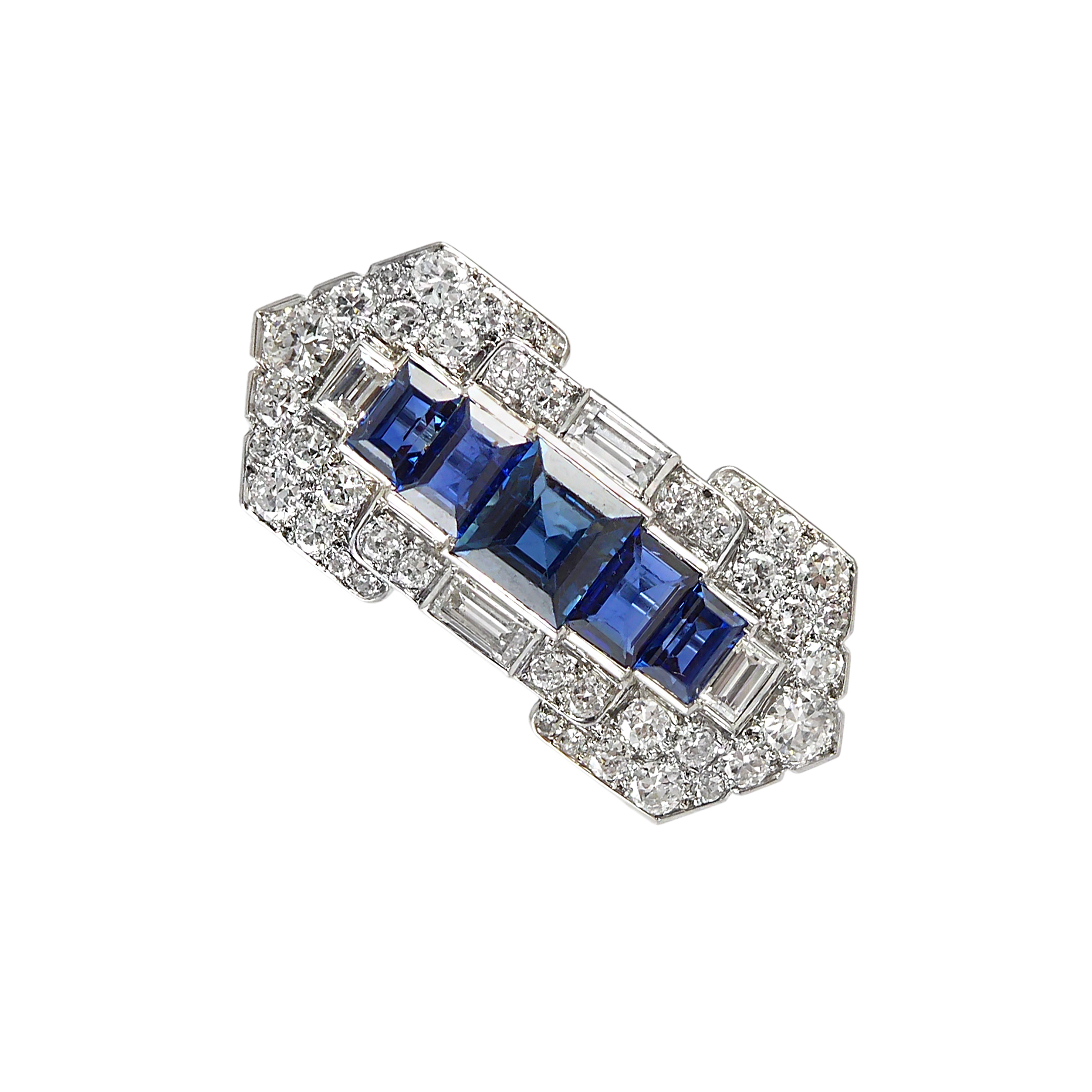 Art Deco sapphire and diamond geometric brooch by Cartier, Paris for Cartier New York c.1927, the oblong panel of stepped design with arrowed ends,