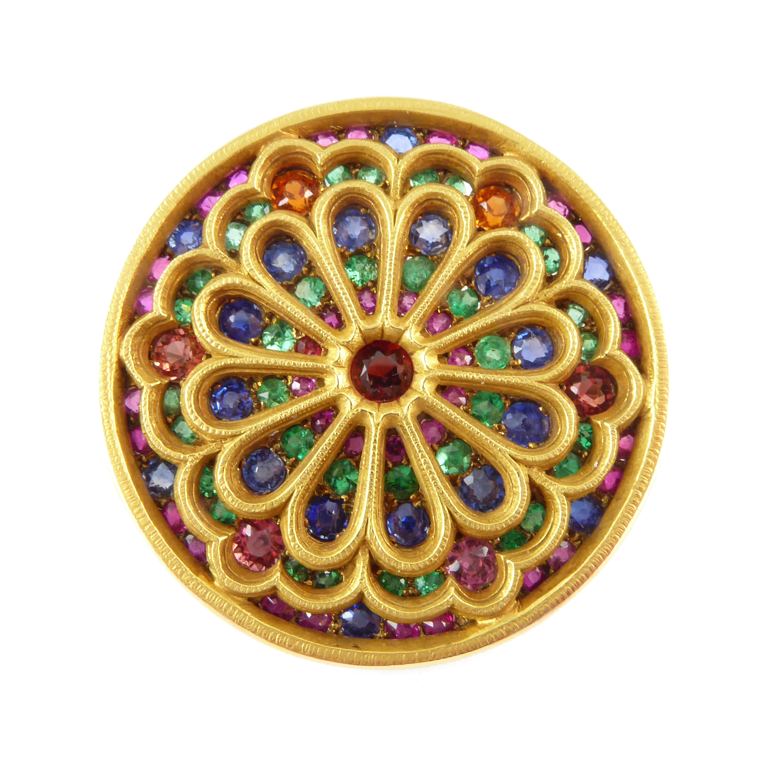 19th century sapphire, ruby, emerald, gem and gold gothic revival brooch, c.1880, in the form of a round stained glass church window,
