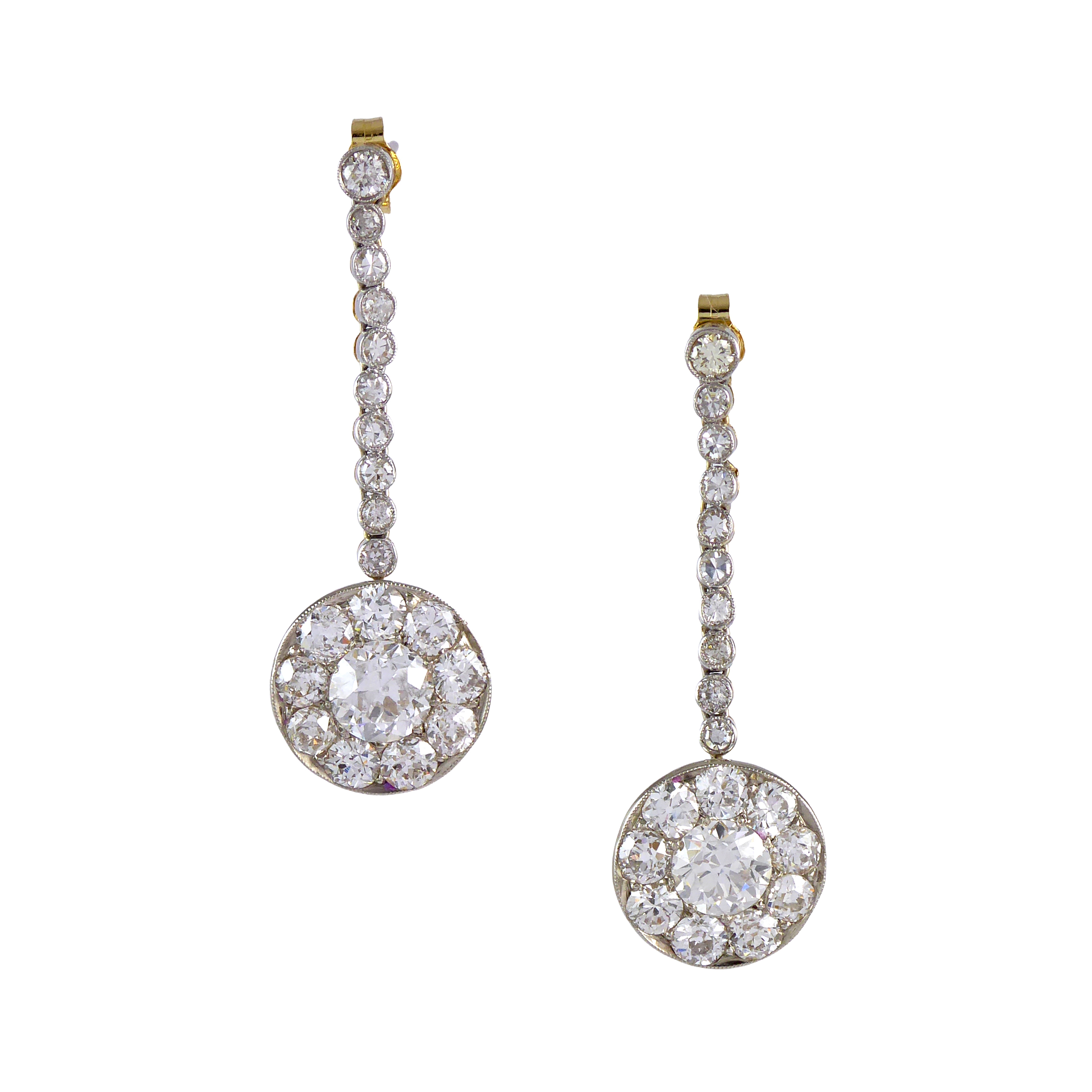 Pair of early 20th century circular diamond panel earrings, c.1915, the round clusters with principal old European brilliant cut to centre,