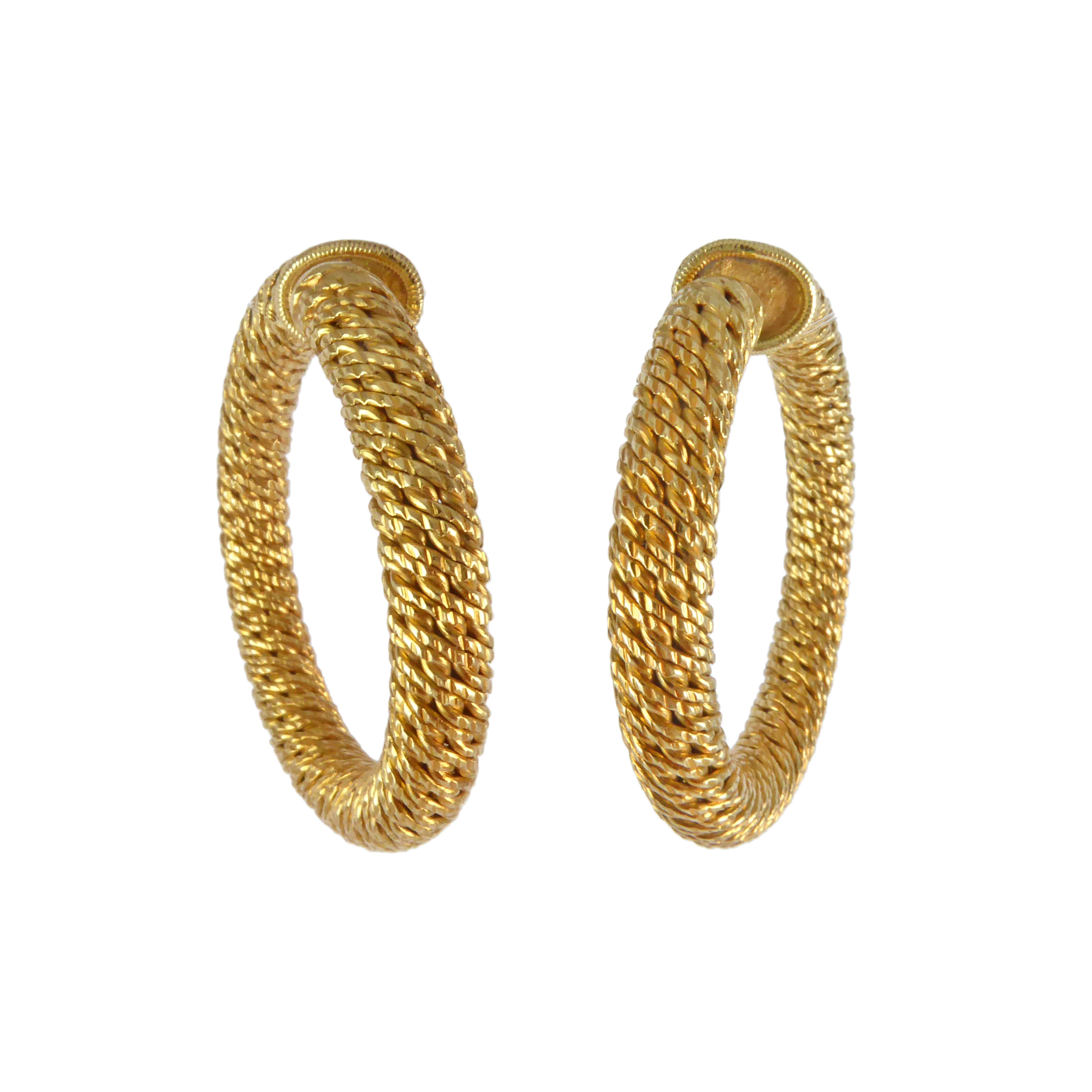 Pair of emerald, ruby and sapphire set hoop earrings by Cartier, the bold yellow C scrolls inset to front with four variously shaped gems,