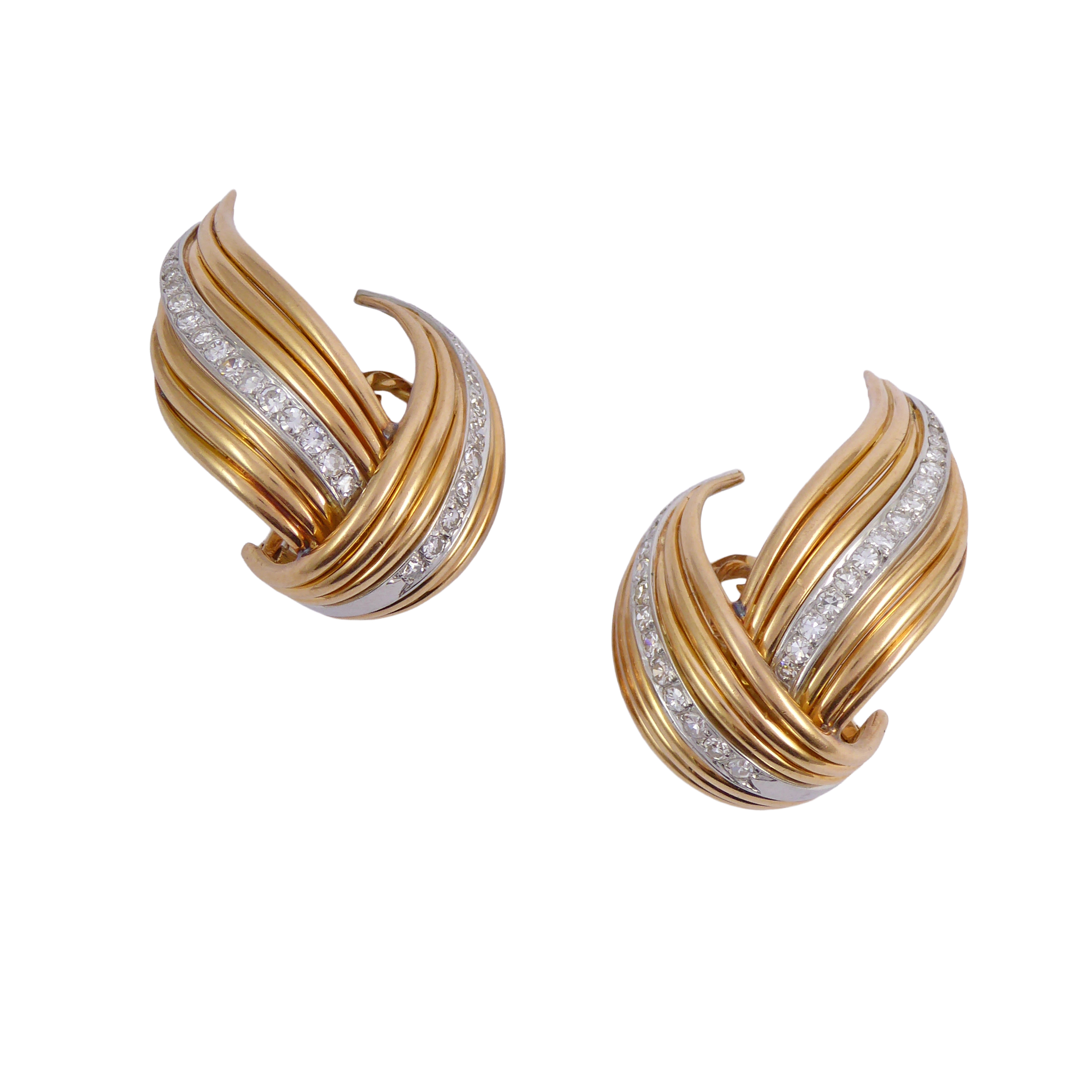 Pair of gold and diamond earrings by Cartier, New York, of radiating wirework fan shape,