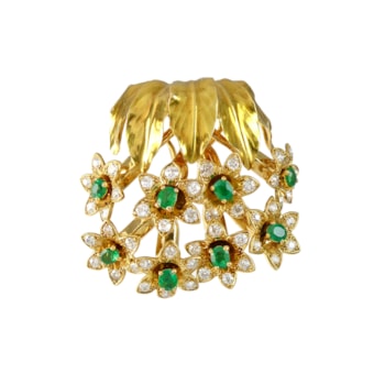 Gold, diamond and emerald floral spray brooch by Cartier, Paris, of articulated hanging design,