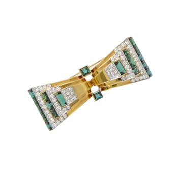 Mid-20th century gold, diamond and green tourmaline stepped bow tie double clip brooch by Cartier, c.1940, of architectural design,