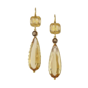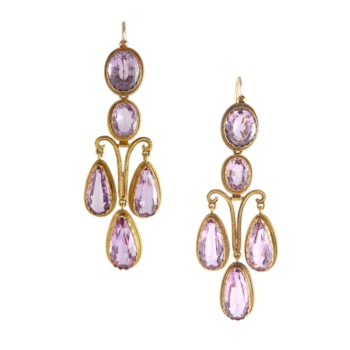 Pair of 19th century pink topaz and gold ropetwist triple drop earrings, probably French c.1860,