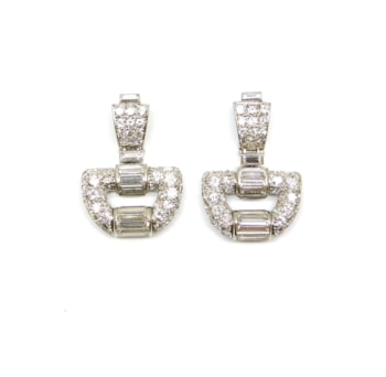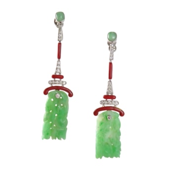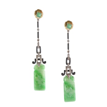 Pair of Art Deco diamond, onyx and carved jadeite panel pendant earrings by Lacloche Freres, Paris,