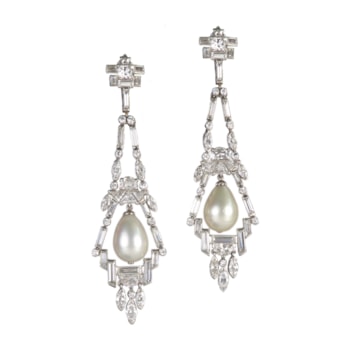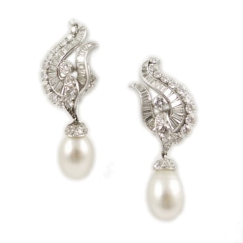 Pair of diamond cluster and natural pearl drop pendant earrings by Van Cleef & Arpels, New York c.1954, each hung with a white drop pearl 8.48ct & 7.66ct,