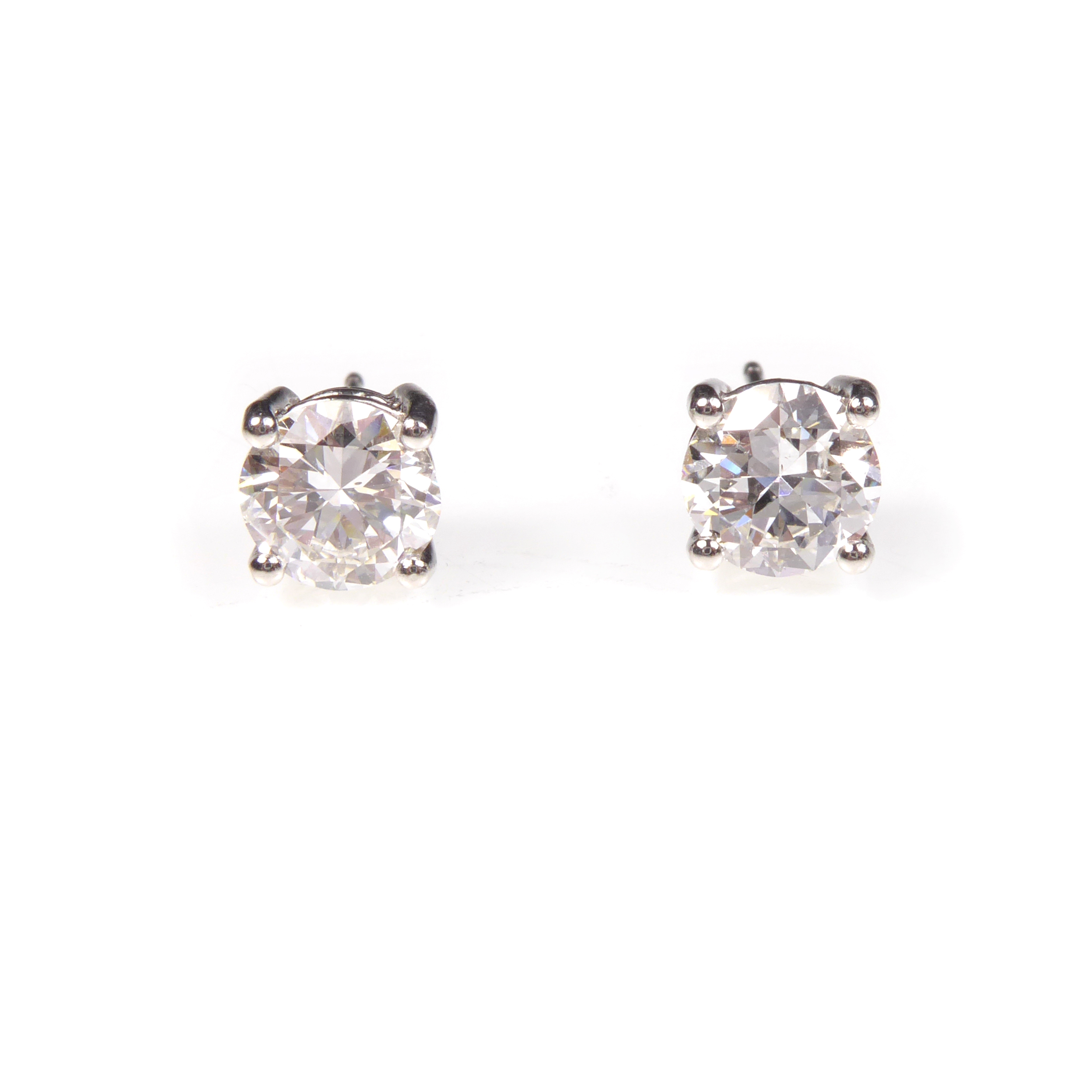 Pair of round brilliant cut diamond stud earrings, four claw set, the modern cuts each of 1.00ct G SI1,