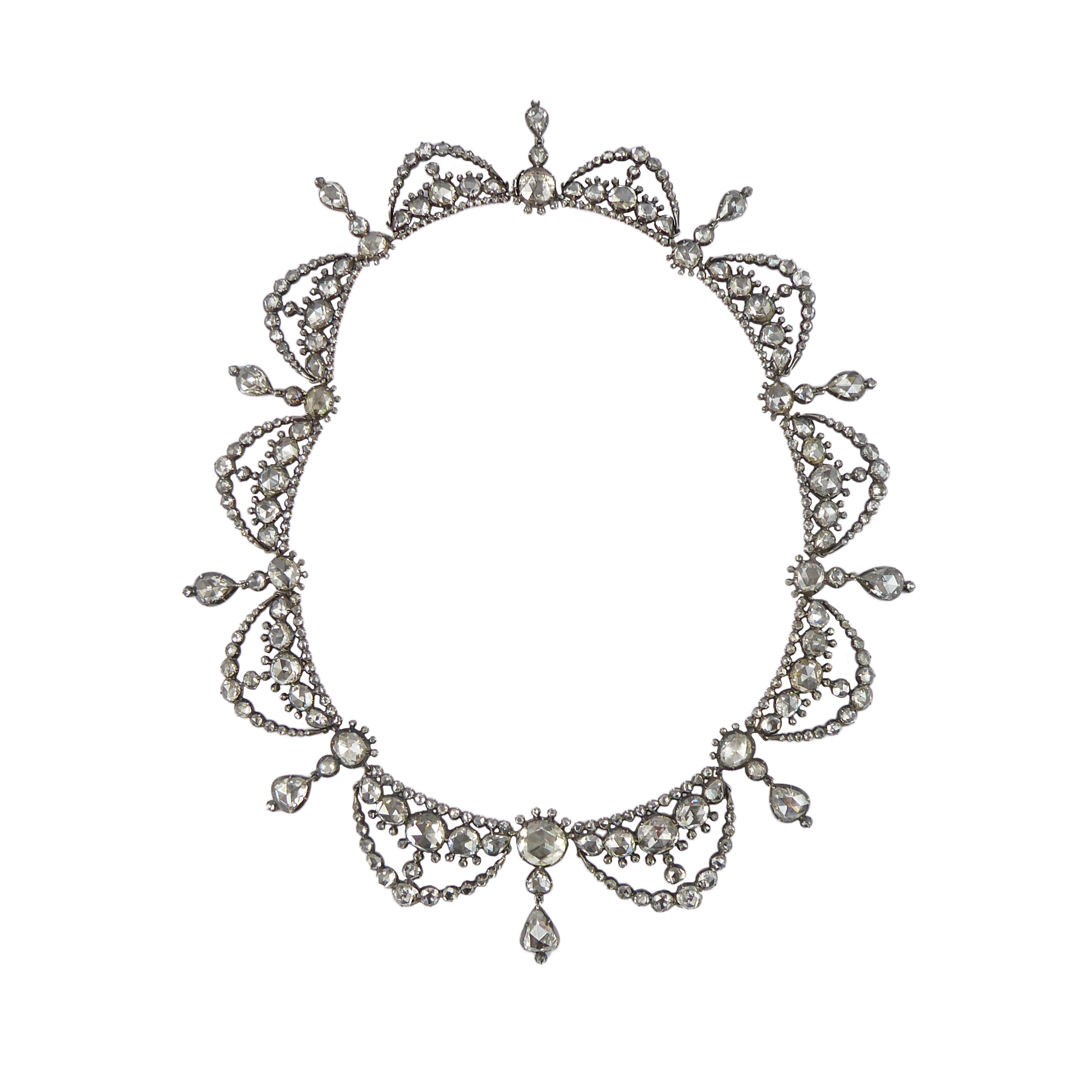 Late 18th / early 19th century graduated rose cut diamond swag collar necklace, c.1800, fringed with drop pendants,