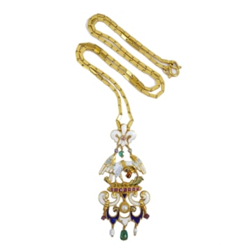 19th century gold, enamel and gem set Renaissance revival pendant with eagle bird by Castellani, Rome c.1860/1870, together with an associated contemporary baton chain necklace,
