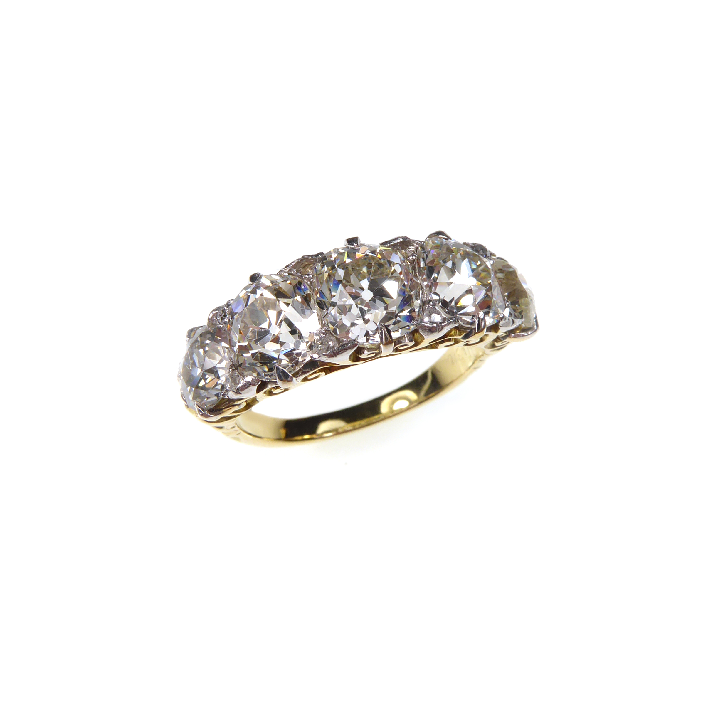 Pair of late 19th /early 20th century five stone diamond rings by Tiffany, c.1900, with graduated old European cut diamonds,