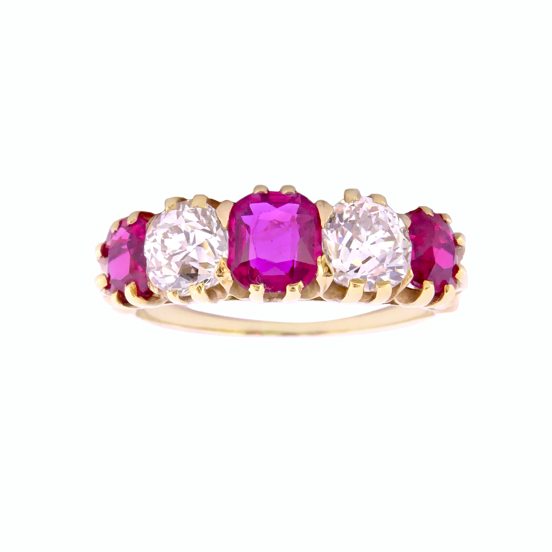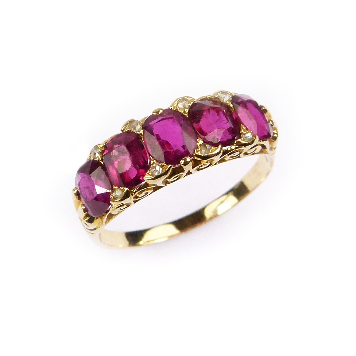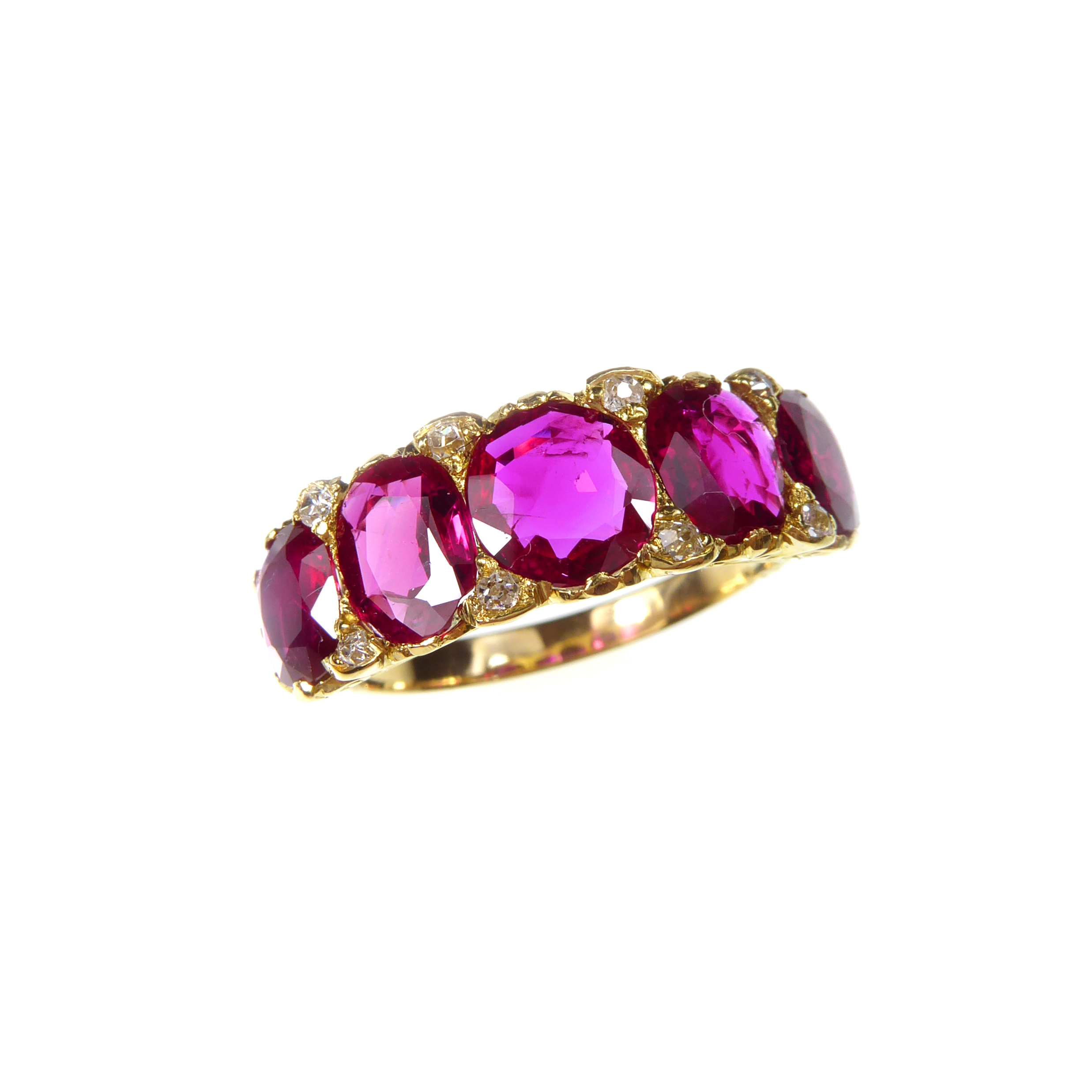 Antique five stone ruby ring, c.1900, the graduated Burma rubies of cushion and rounded facetted cut,