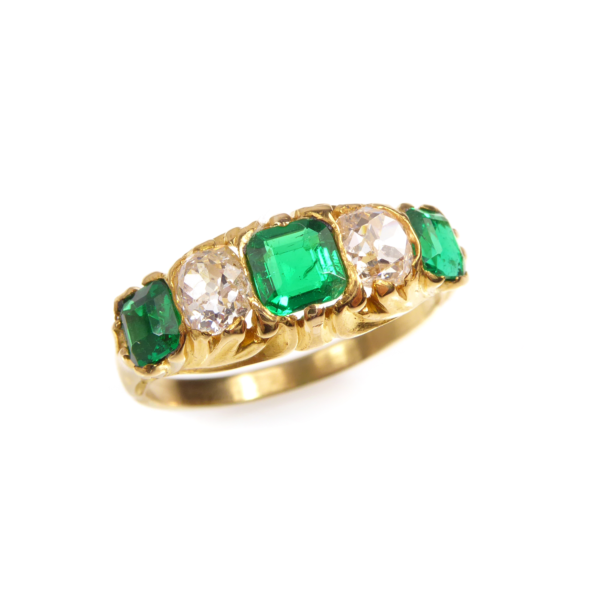 Antique emerald five stone ring, c.1890, with graduated Colombian emeralds approximately 2.40cts in all,