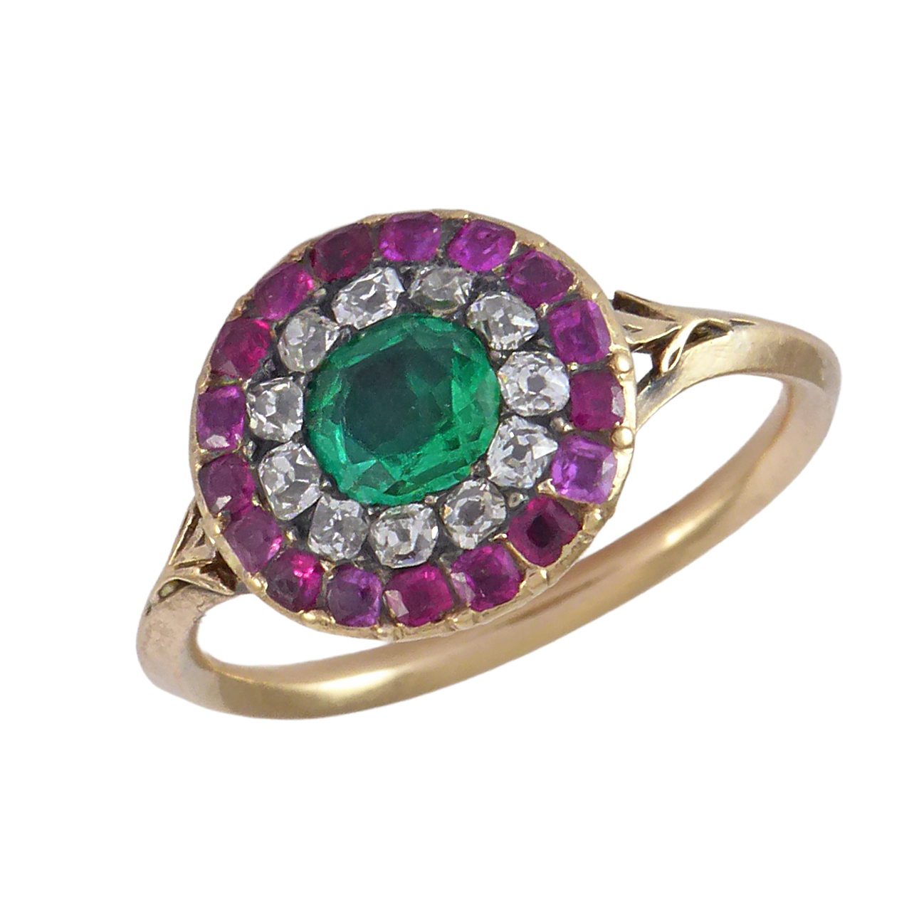 18th century emerald, ruby and diamond target cluster ring, c.1780, central rounded facetted emerald,