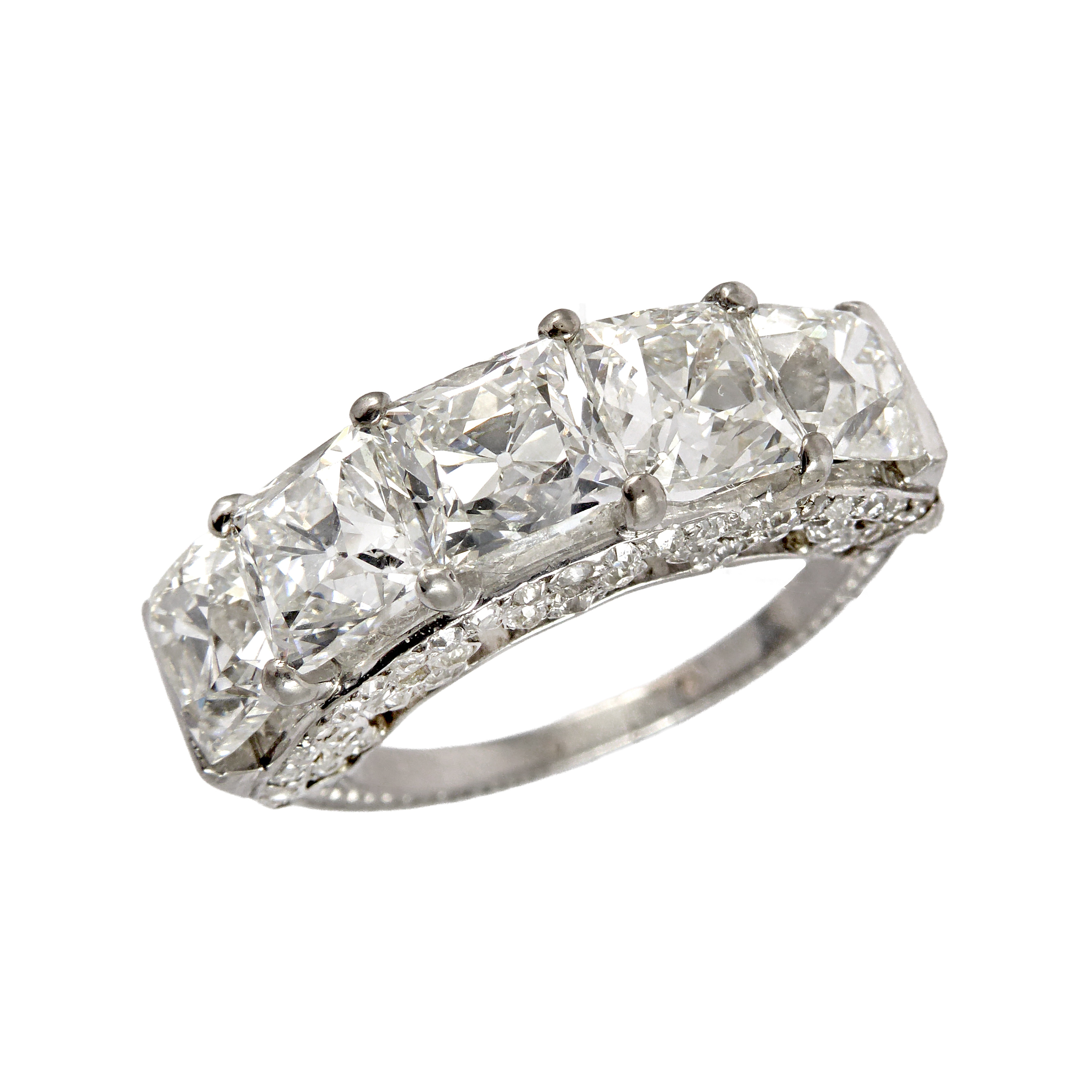 19th century cushion cut diamond cluster ring, c.1880, of rounded outline and centred by a principal square-cushion cut diamond of approximately 5.55ct,