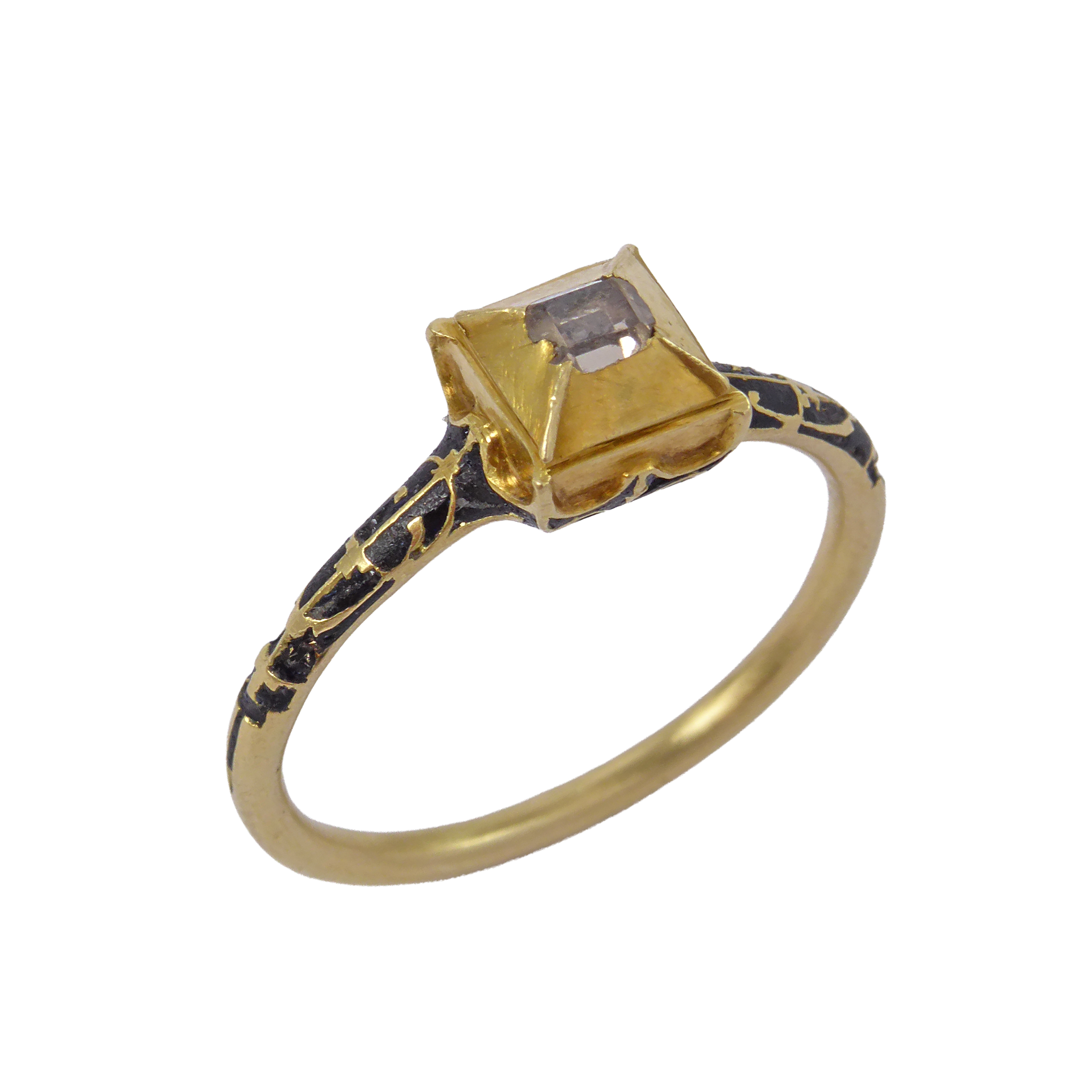 Late 16th / early 17th century table cut diamond, gold and enamel ring, c.1600, the box bezel set with a single diamond of rectangular outline,