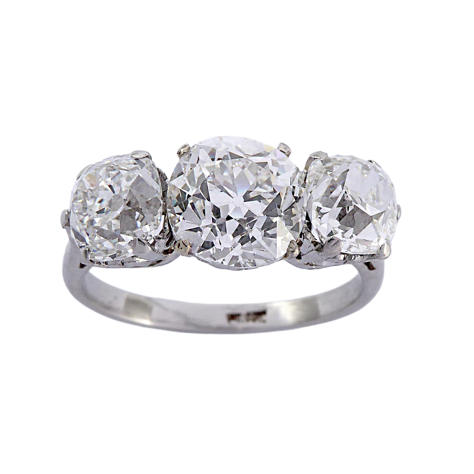 Three stone graduated old cushion cut diamond ring, the old mine cut diamonds of 2.02ct G SI, 1.09ct F SI1 and 1.02ct G VS2,