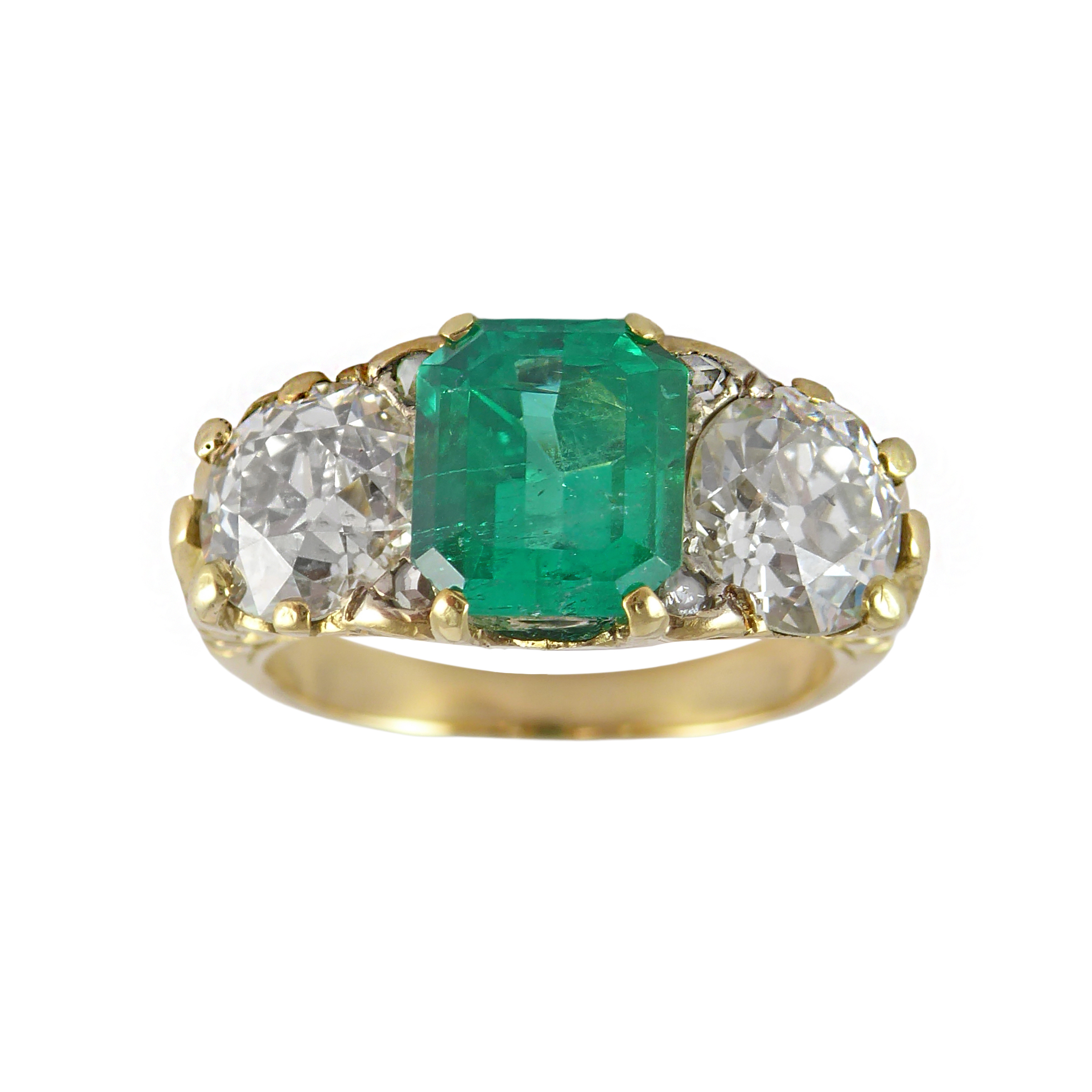 Late 19th / early 20th century emerald and diamond three stone ring, c.1900, central cut corner rectangular emerald of step cut, approximately 2.18ct,