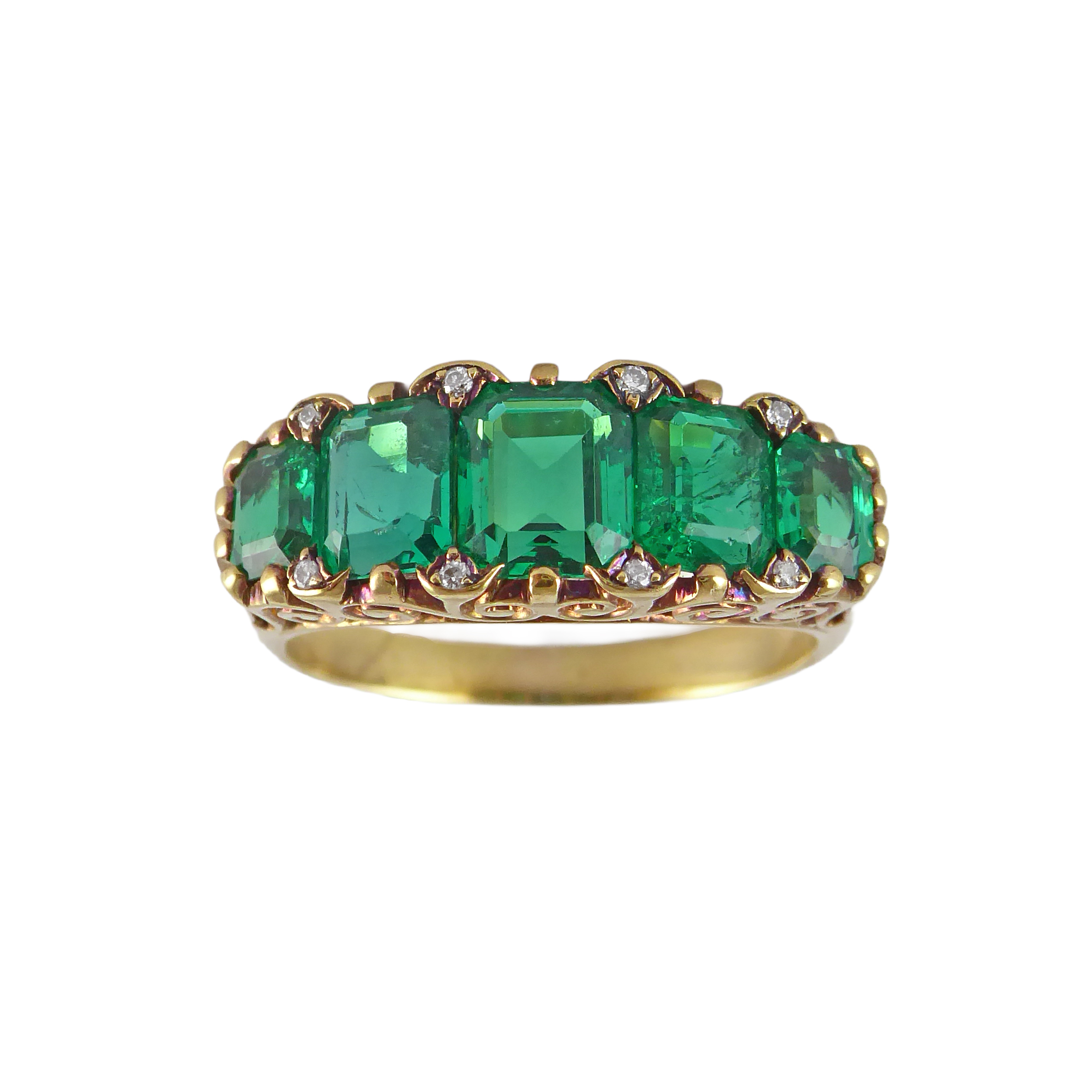 Antique five stone emerald and gold ring, c.1890, with graduated Colombian stones of emerald cut,