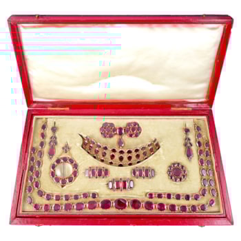 Late 18th century garnet collet suite, c.1800, comprising a necklace with pendant; pair of bracelets; pair of pendant earrings; a coronet shaped brooch converting to hair comb; three line brooches; a round cluster brooch and a twin circular cluster fastener jewel,