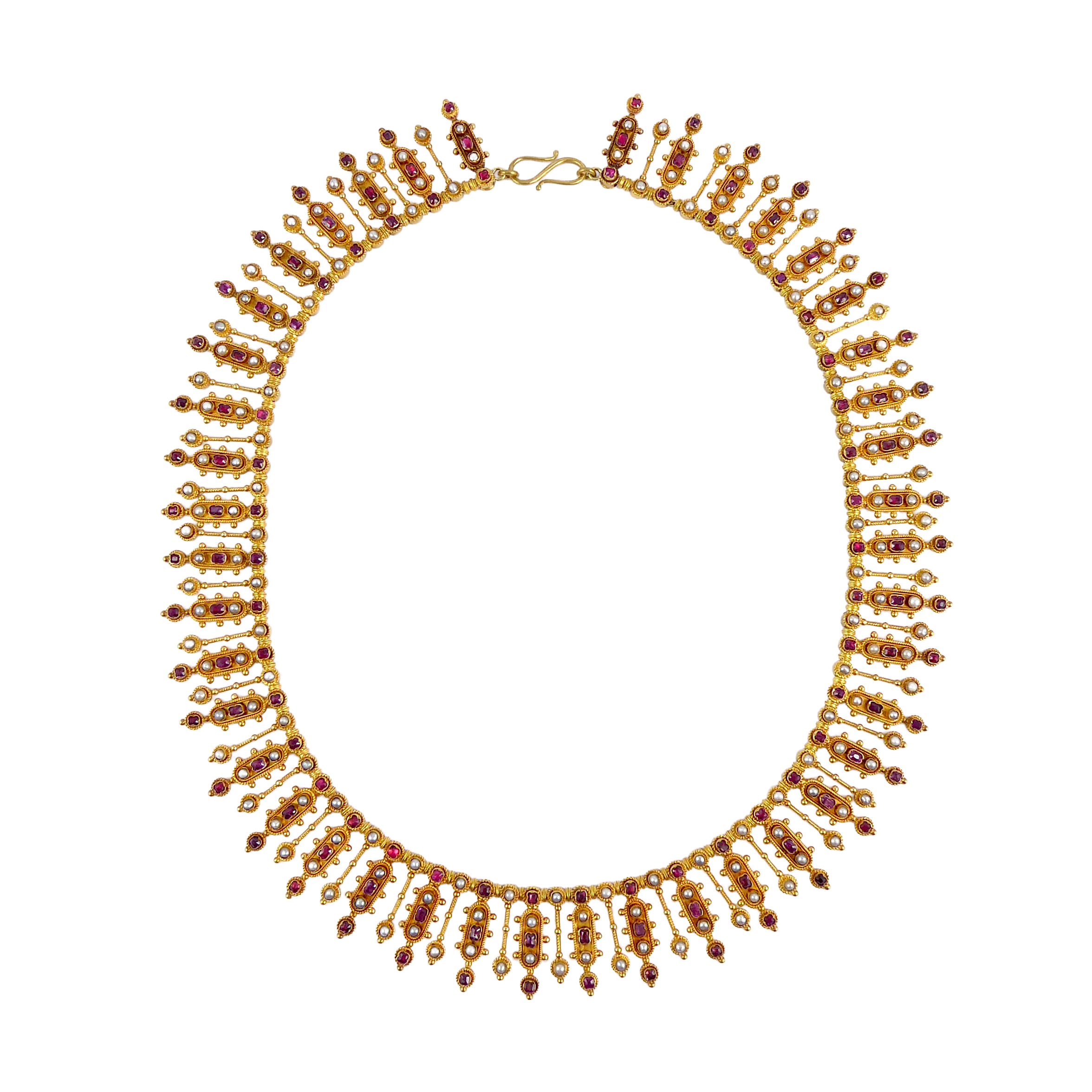 19th century gold, ruby and pearl Renaissance revival fringe necklace, c.1870, in the manner of Ernesto Pierret,