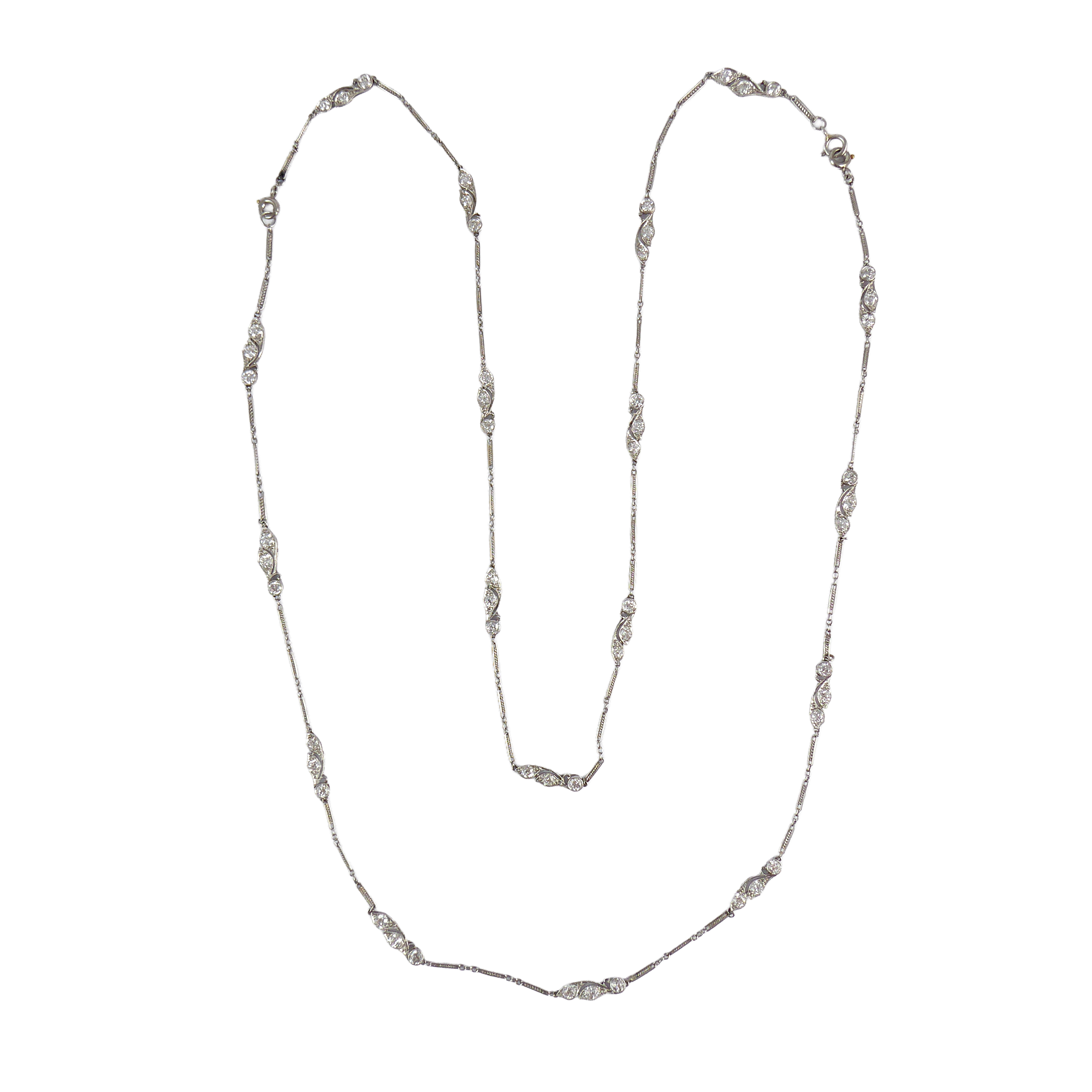 Platinum fetter link long chain necklace spaced by three diamond set cluster links,