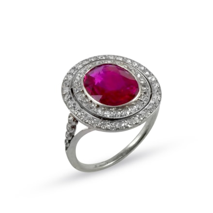 Single stone ruby and diamond cluster ring, collet set with a 2.54ct shaped oval facetted Burma ruby,