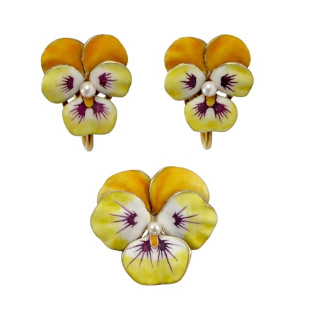 Antique pale orange and green enamel and pearl pansy brooch, c.1900, probably American,