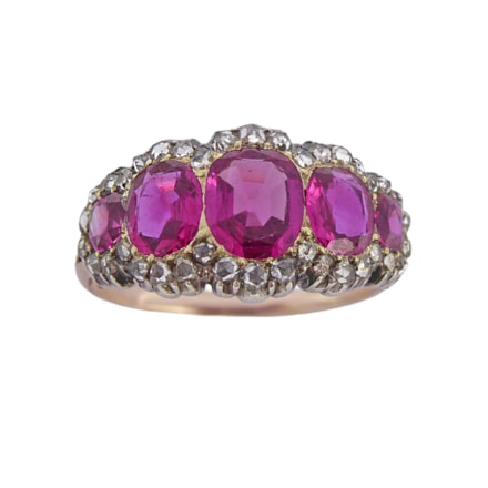 Late 19th century five stone ruby ring, c.1890, the graduated cushion cut Burma rubies, approximately 4.10cts, with eight rose cut diamond points in between, to a pierced and scroll engraved gallery, fluted shoulders, mounted in 18ct gold, stamped '18CT', accompanied by GCS report no. 5776-4880 giving a Burma origin opinion for the rubies and that they show no evidence of heat treatment