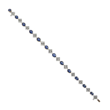 Late 19th / early 20th century graduated sapphire and diamond cluster bracelet, c.1900, with seven cushion cut Ceylon sapphires, the largest to centre of 18.51ct,