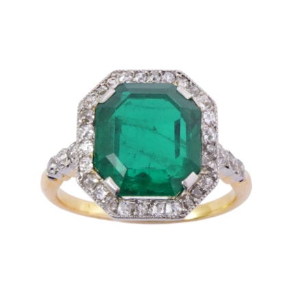 between old European brilliant cut diamonds totalling approximately 2.20cts, rose cut diamond points between, claw set in a scroll carved gallery and with fluted shoulders, mounted in gold testing as 18ct Emerald approximately 7.70 x 6.70 x 5.30mm