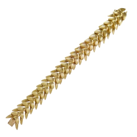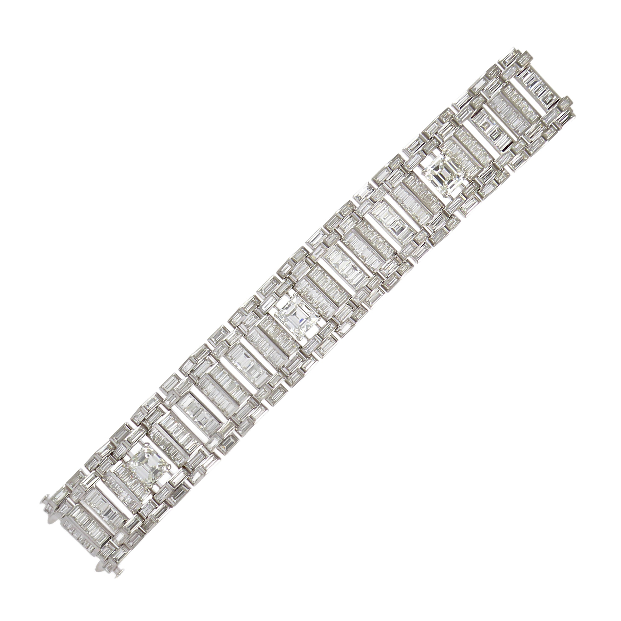 Art Deco bold geometric diamond chevron strap bracelet, French, set with rectangular and baguette cuts featuring three principal diamonds of 4.08ct E VS2; 3.74ct H SI1 and 3.65ct J VS2,