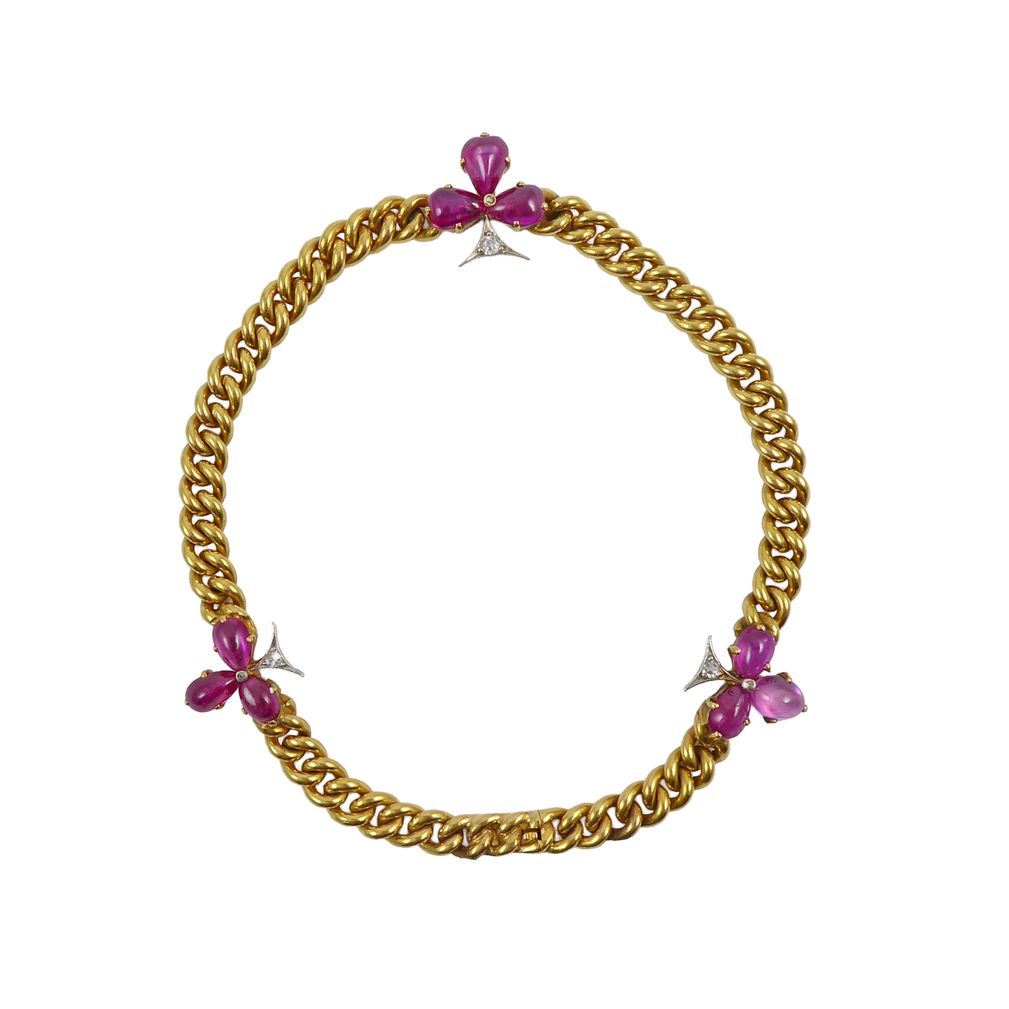 Late 19th / early 20th century gold, ruby and diamond bracelet, French c.1900, spaced by trefoil ruby clovers,