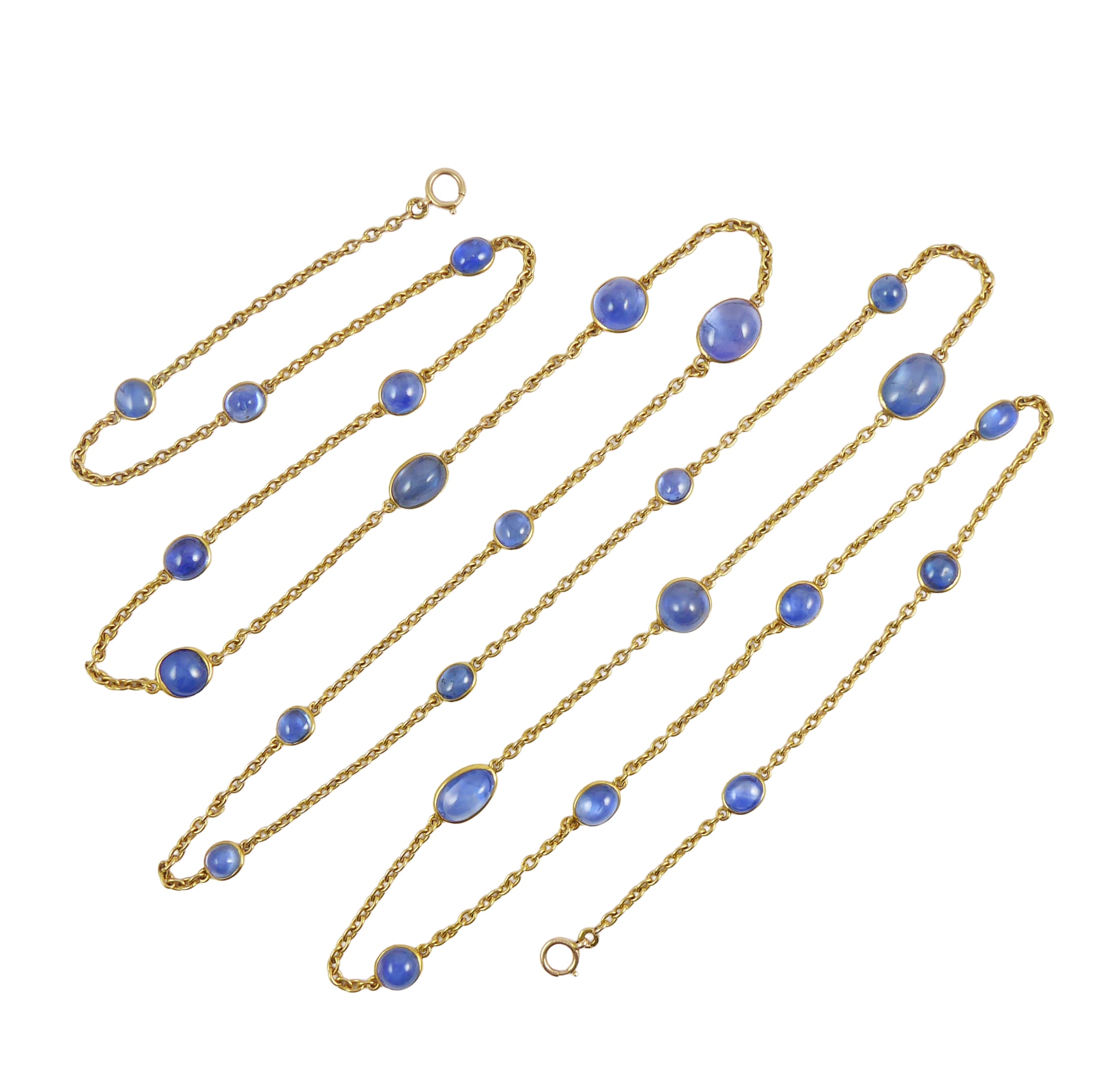 Late 19th / early 20th century Russian spectacle set sapphire and gold long chain necklace by Fyodor Ruch of St. Petersburg, assayed Moscow 1898-1908, the chain spaced by 24 cushion, round and oval cabochon sapphires,