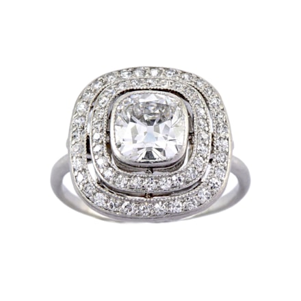Art Deco diamond and sapphire lozenge cluster ring, c.1920, of geometric design, the central old European cut diamond of 1.80ct M SI2,