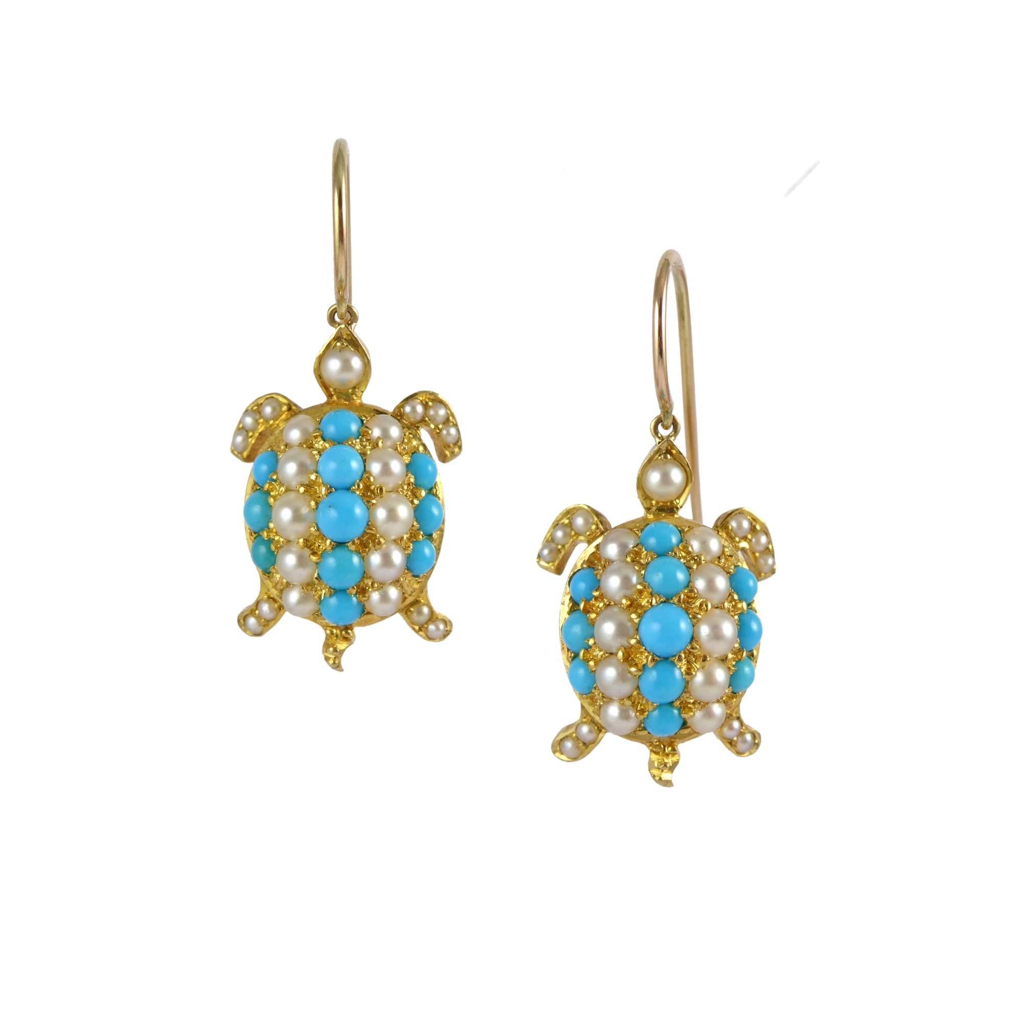 Pair of 19th century gold, turquoise and pearl tortoise earrings, c.1890,
