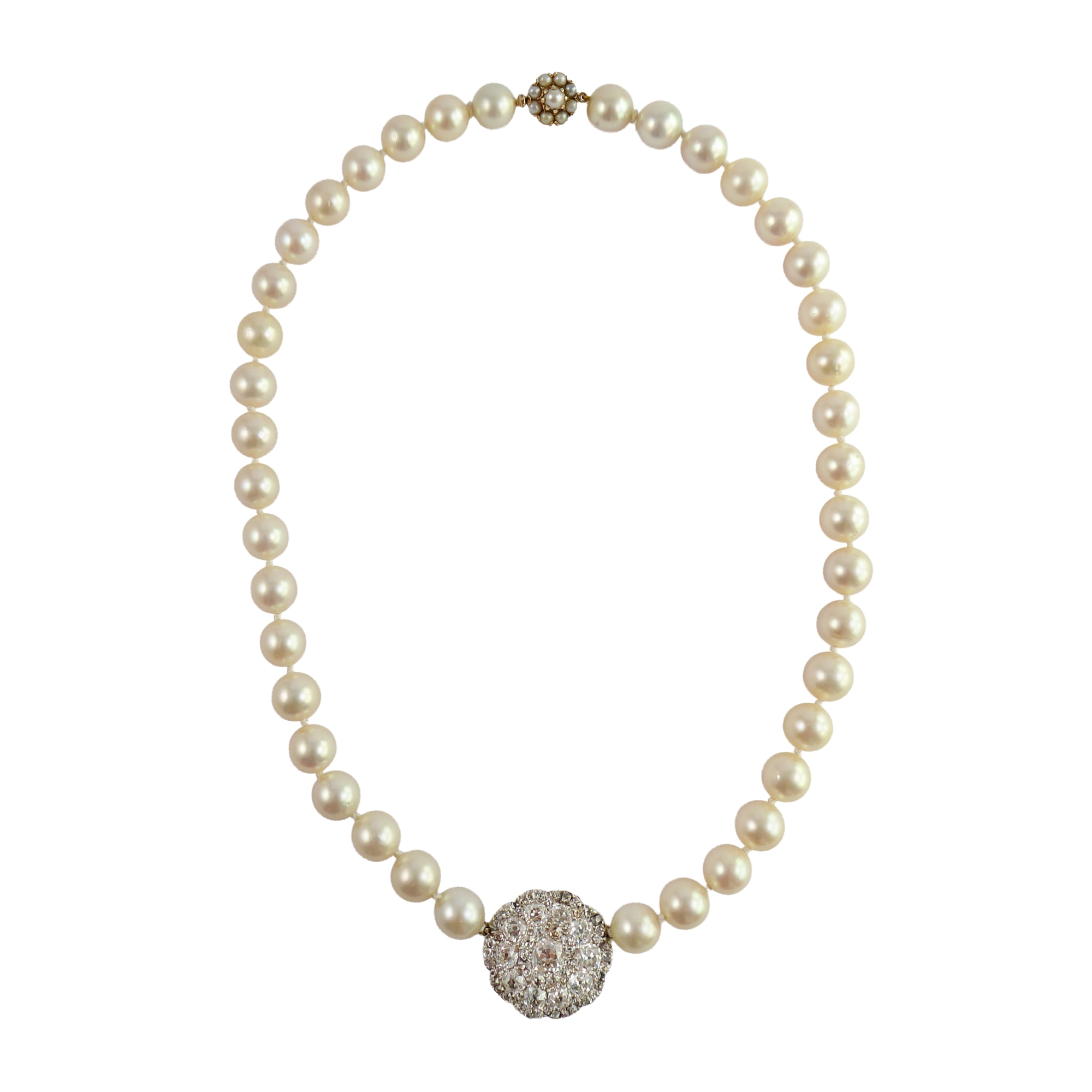 the cluster featuring a larger old mine cushion cut diamond to centre to a three row border, the rows graduating from small to larger and smallest to the outside, close cut down collet set in silver, the late 20th century cultured pearls of approximately 9-9.5mm and opening on a late 20th century 9ct gold and cultured pearl cluster clasp Cluster diameter 2.4cm / 15/16''
