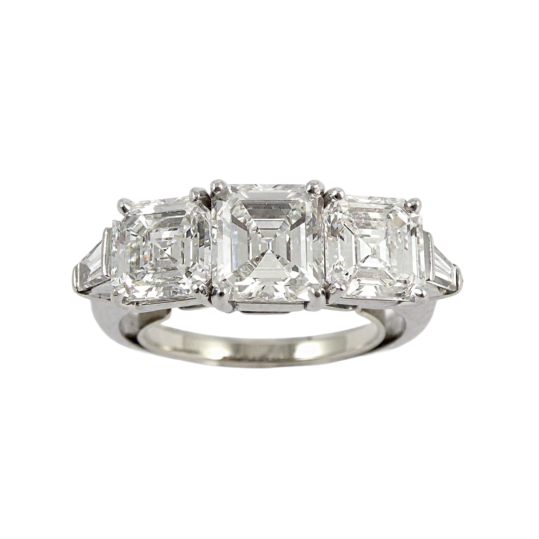 Three stone Asscher cut diamond ring, the graduated diamonds totalling approximately 3.20cts and G/H, VS,