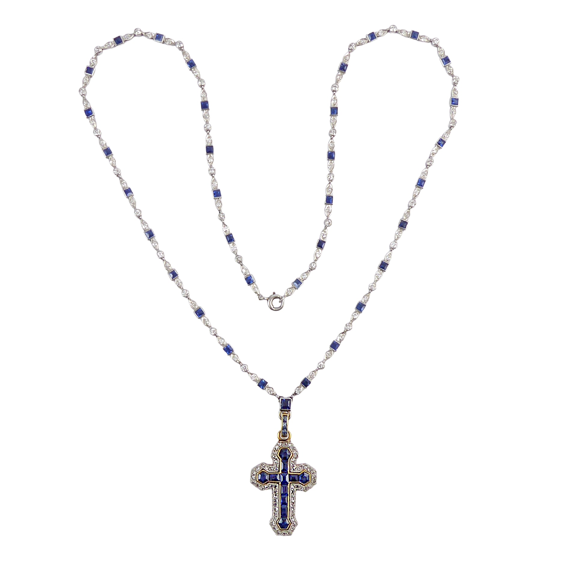 the cross of Latin form with a central line of calibre cut sapphires, bordered by rose cut diamonds, the sapphires within a gold channel and the diamonds millegrain set in platinum all with a gold back, hung from a detachable sapphire line and gold suspension loop, upon a calibre sapphire and diamond collet chain necklace, formed of small round diamond collets alternating small three-stone square sapphire and diamond mini-bow links, featuring a square cut sapphire collet with round cut diamond above and below in petal-shaped collets, the diamonds to the chain all of old and transition brilliant cut, open set and mounted in platinum, approximately 2.00cts of diamonds in all Length of cross pendant including suspension loop 3.4cm / 1 3/8''