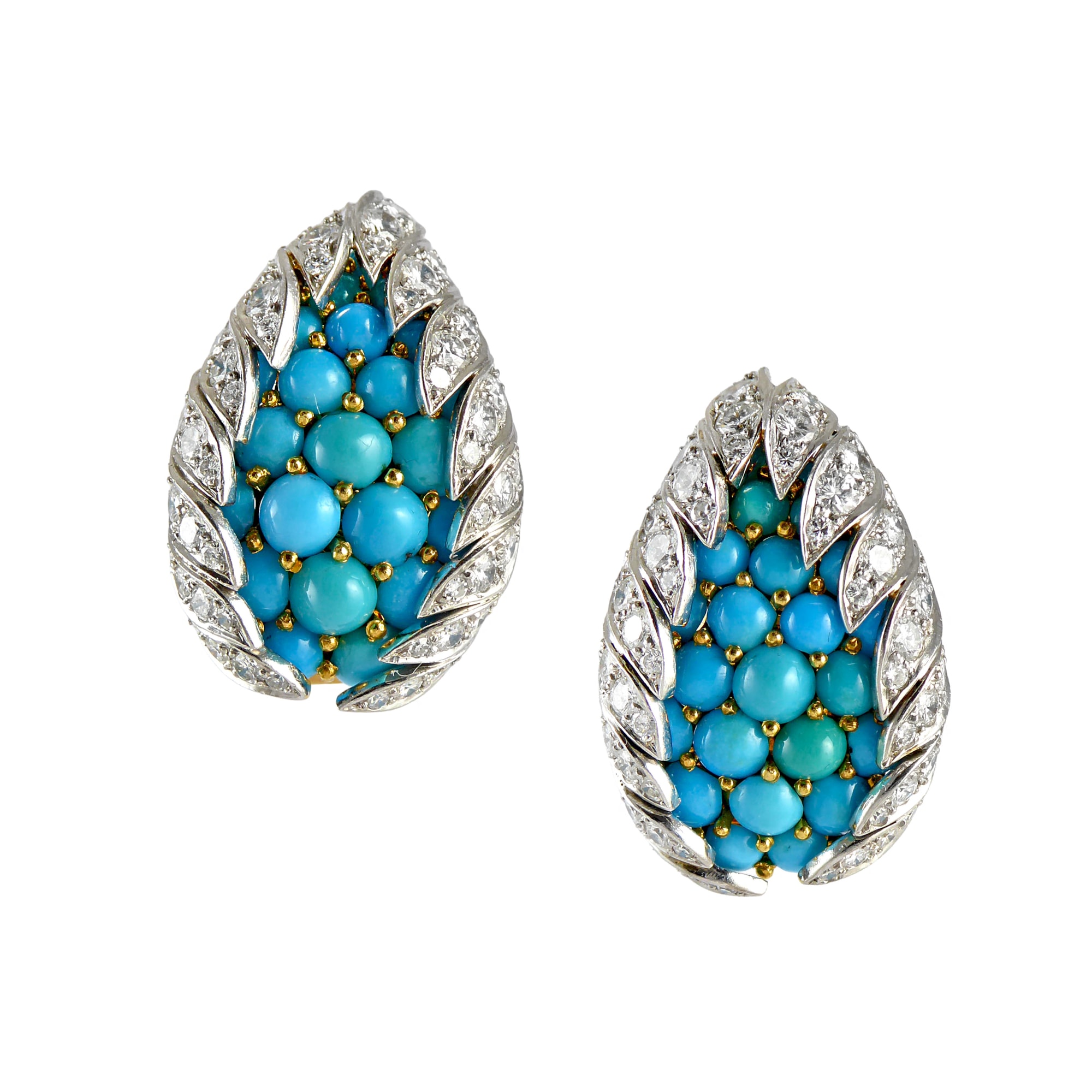 Pair of turquoise and diamond leafy bud cluster earrings by Van Cleef & Arpels, possibly made in Paris for New York retail,