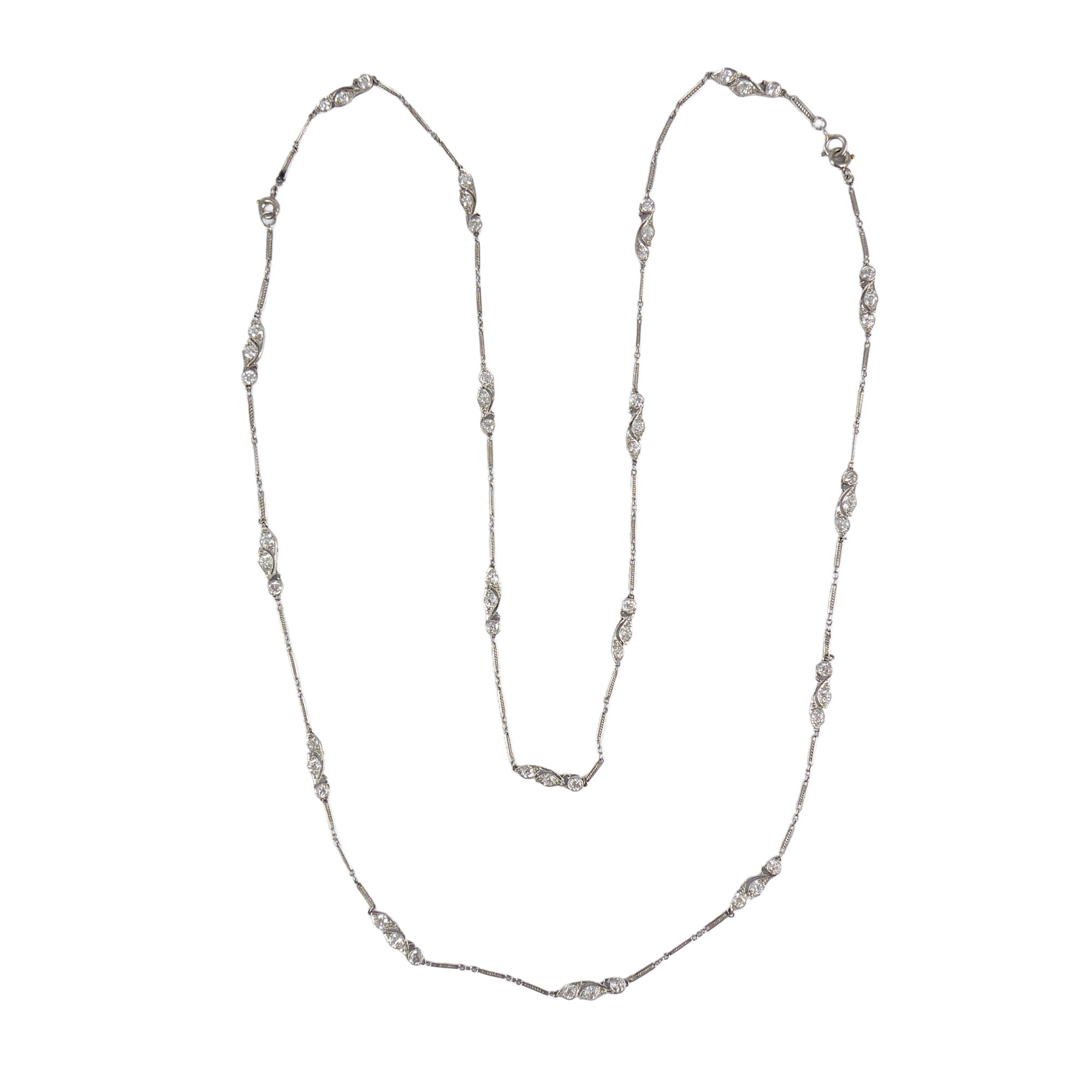 Early 20th century diamond and platinum chain necklace, c.1915, spaced by three-stone diamond stylised foliate motifs,