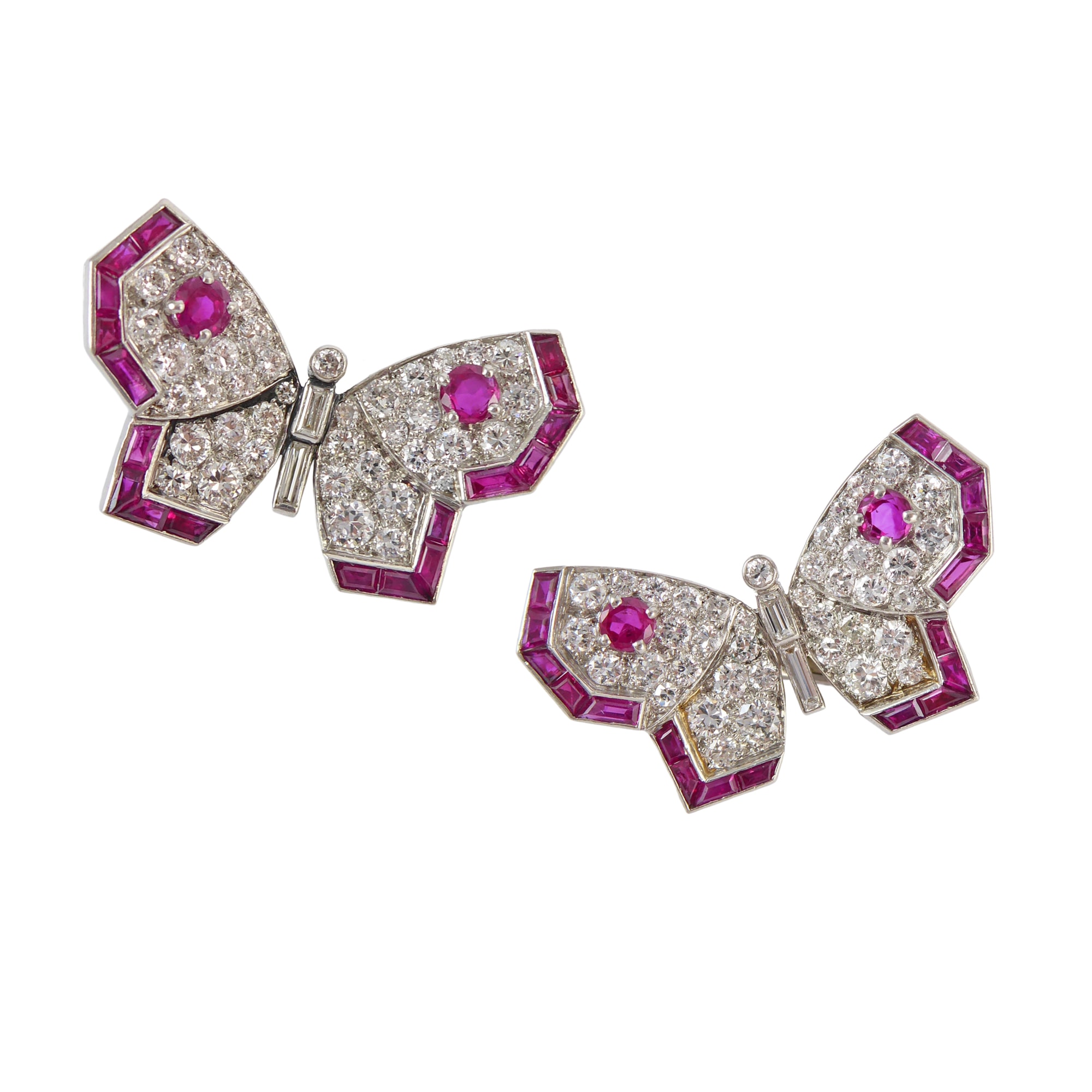 Pair of late Art Deco diamond and ruby butterfly earrings by Cartier, London, of geometric design,
