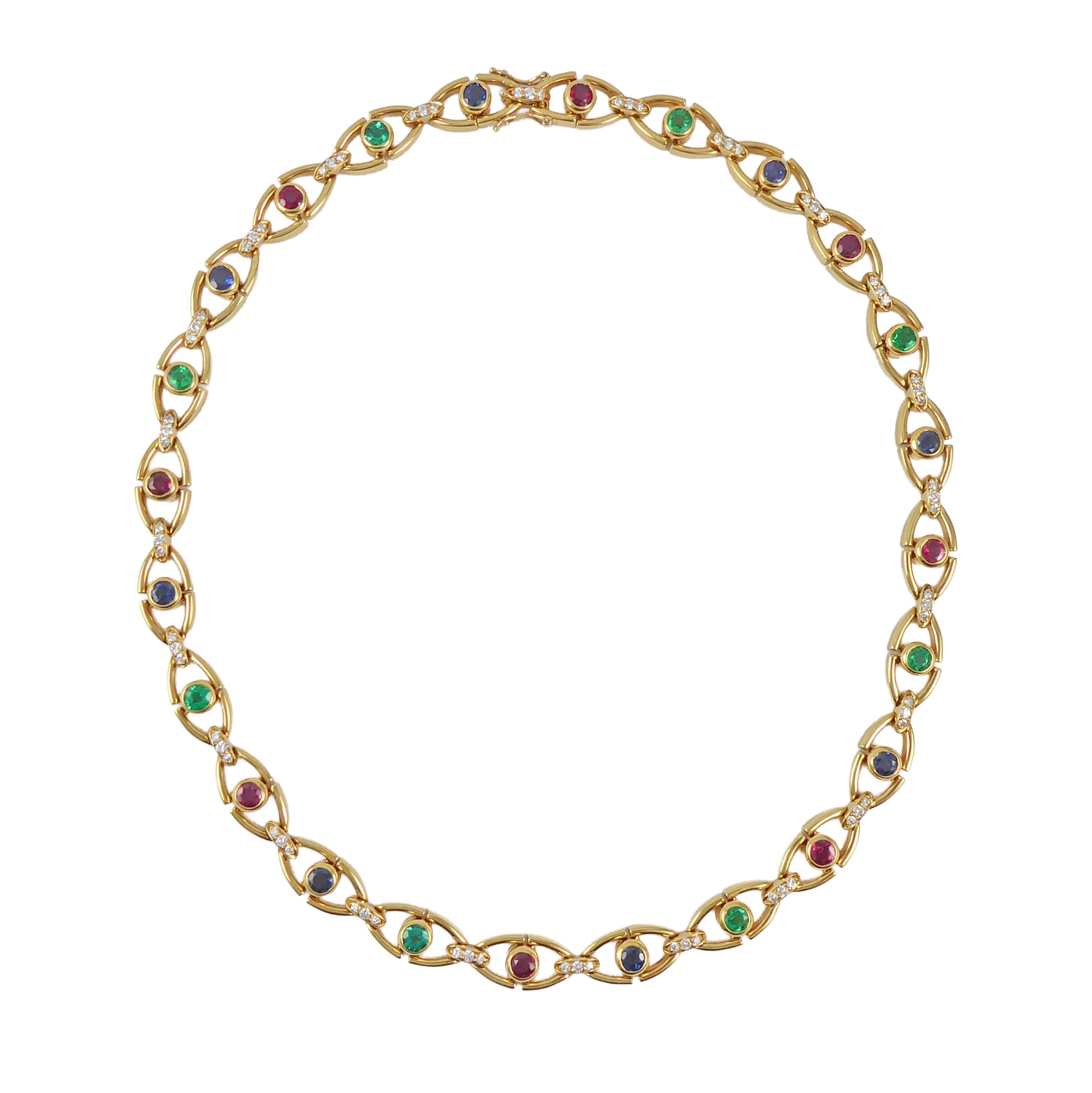 Emerald, sapphire, ruby and diamond necklace by Tiffany, to articulated openwork navette shaped links testing as 18ct gold,