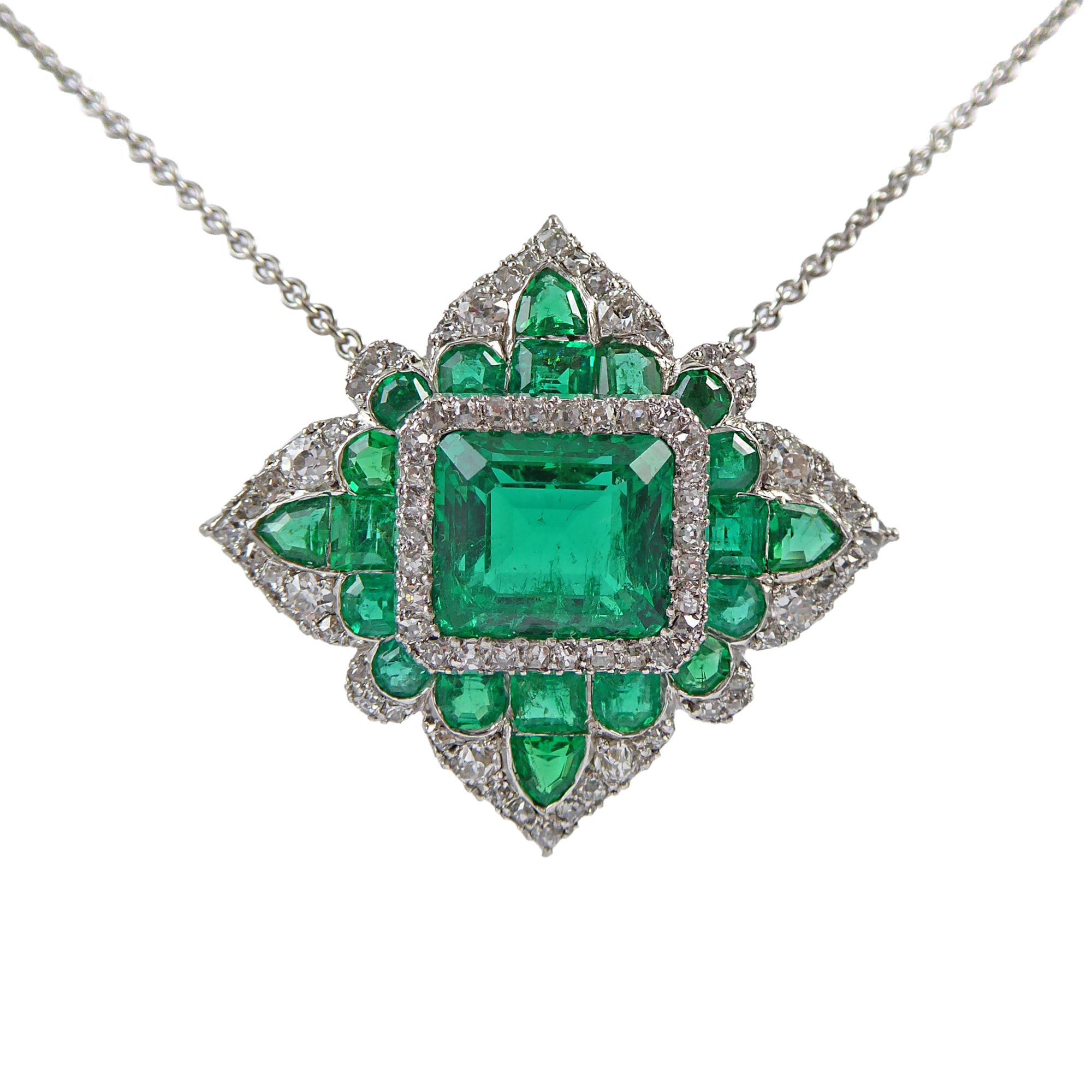 raised in a line border of old single cut diamonds, to a lozenge shaped outer cluster, the ground set with fancy calibre cut emeralds giving a petal and scalloped frame, outer border of old double-eight and single cut diamonds, open cut down collet set in platinum, hung landscape on a later 18ct white gold tracelink chain necklace, approximately 1.05cts of diamonds in all, accompanied for the main emerald by SSEF report no. 151790 giving a 2.929ct weight, Colombian origin opinion and that is shows minor oil treatment, Length 2.7cm / 1 1/8''