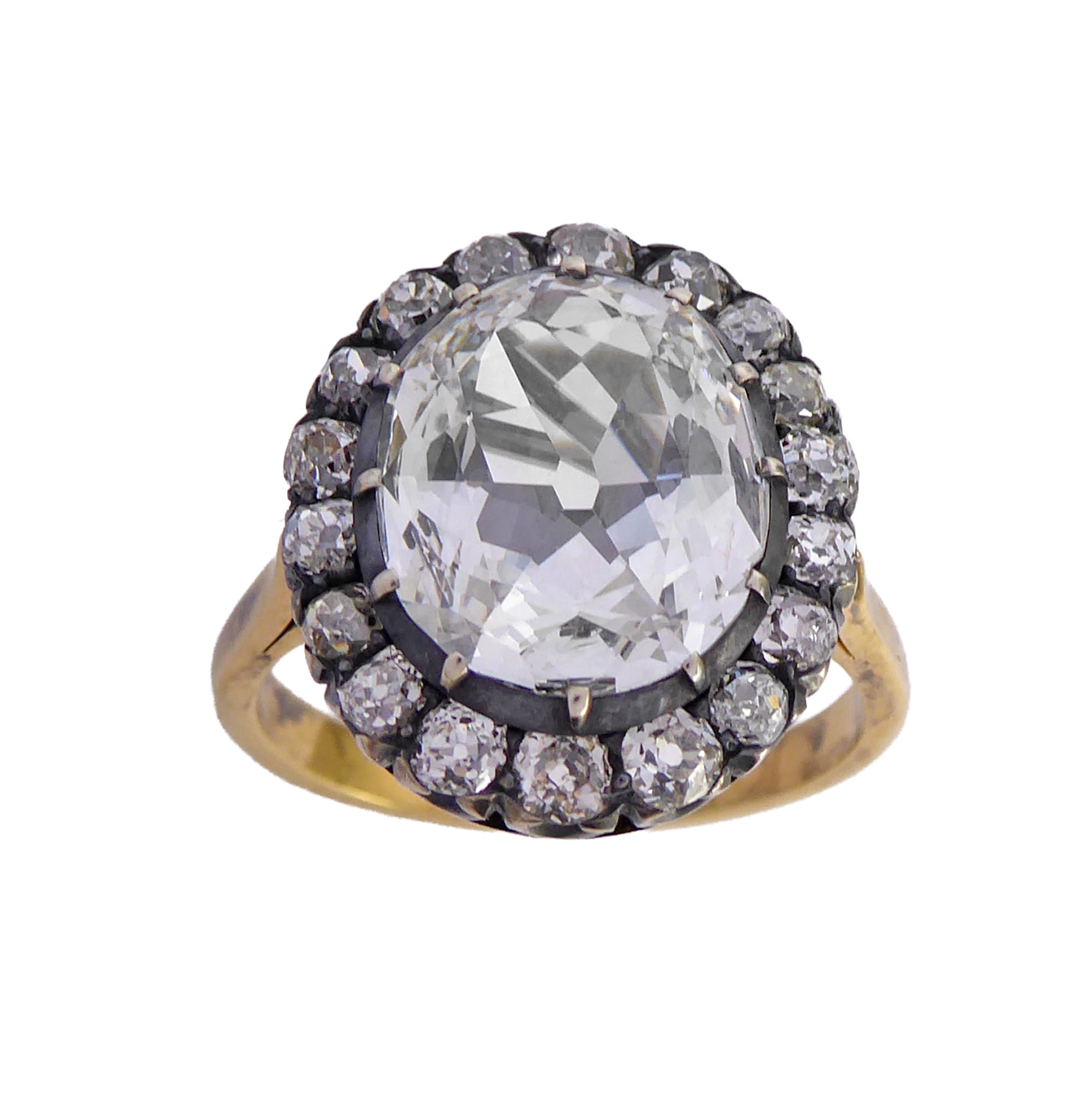 Antique old cut diamond cluster ring of oval shape, c.1900, the old ovalish-oblong brilliant cut diamond, very approximately 2.50ct,