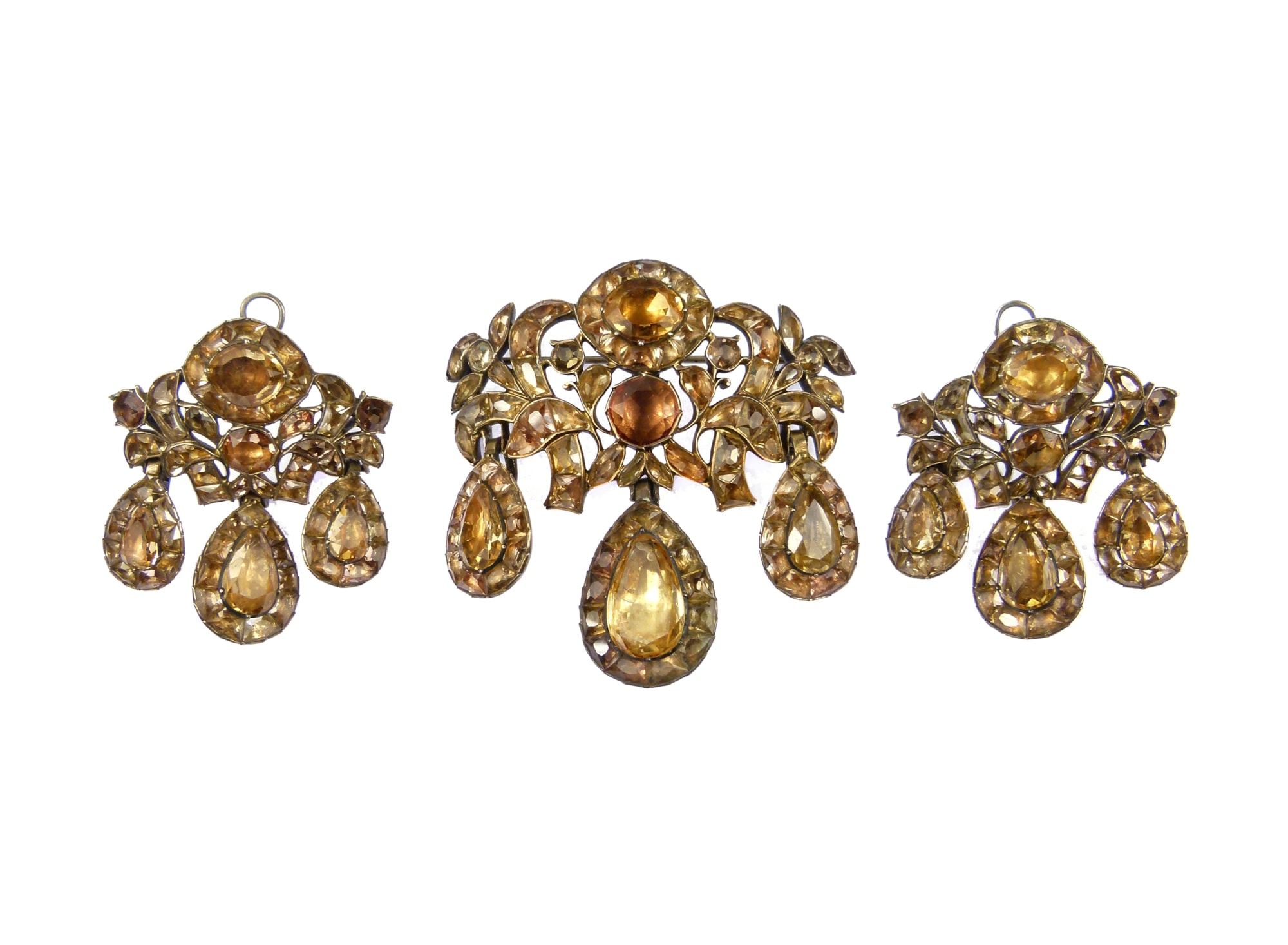 18th century foiled light orange topaz triple drop demi-parure of brooch and pair of earrings, Portuguese c.1770, of girandole design,