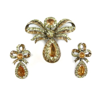 18th century foiled orange topaz and chrysolite bow pendant and pair of earrings, Portuguese c.1770,Ref No. 66677 Details