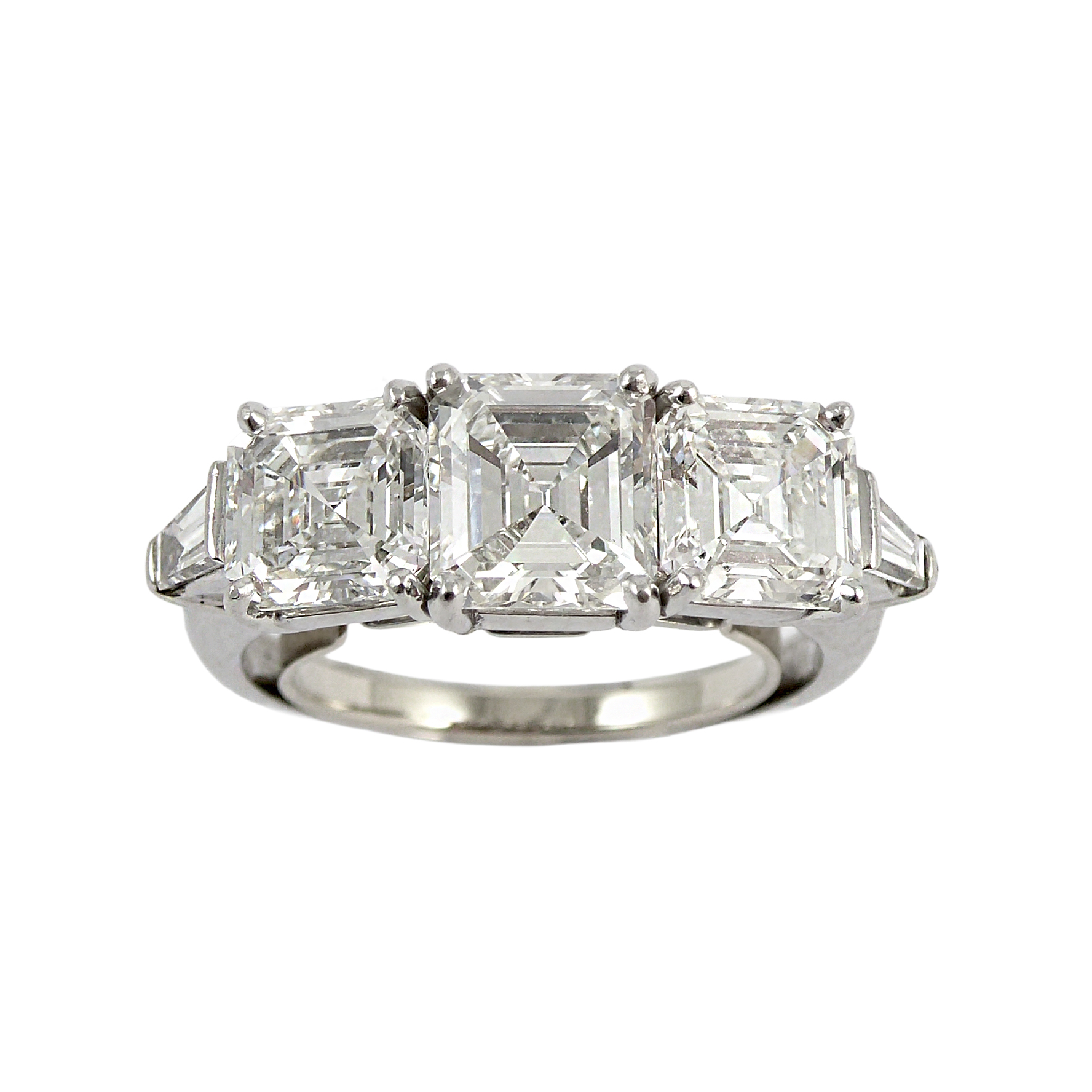 Three stone Asscher cut diamond ring, the graduated diamonds totalling approximately 3.20cts and G/H, VS,