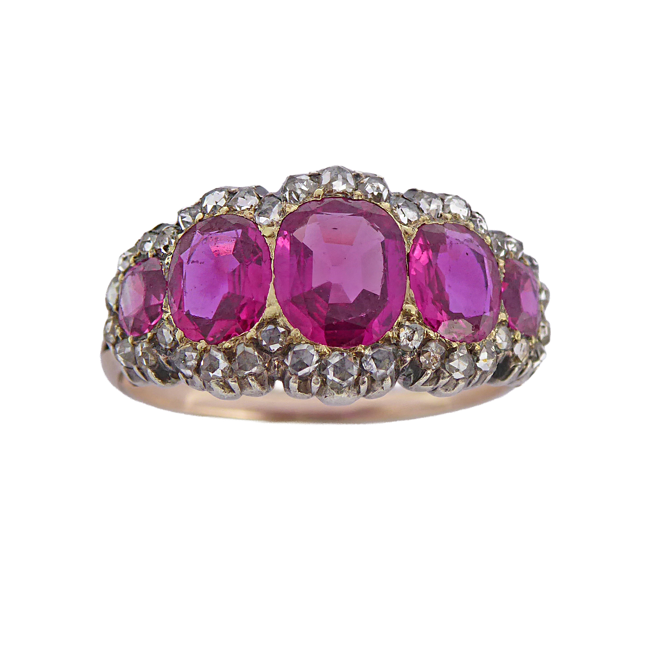 Late 19th century five stone ruby and diamond cluster ring, possibly French, c.1890, with cushion cut rubies totalling approximately 2.00cts,